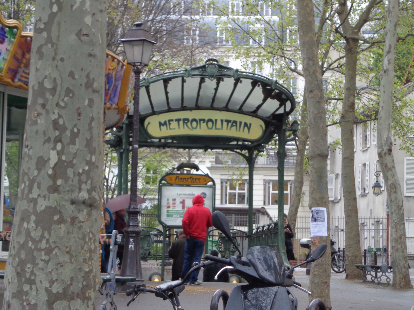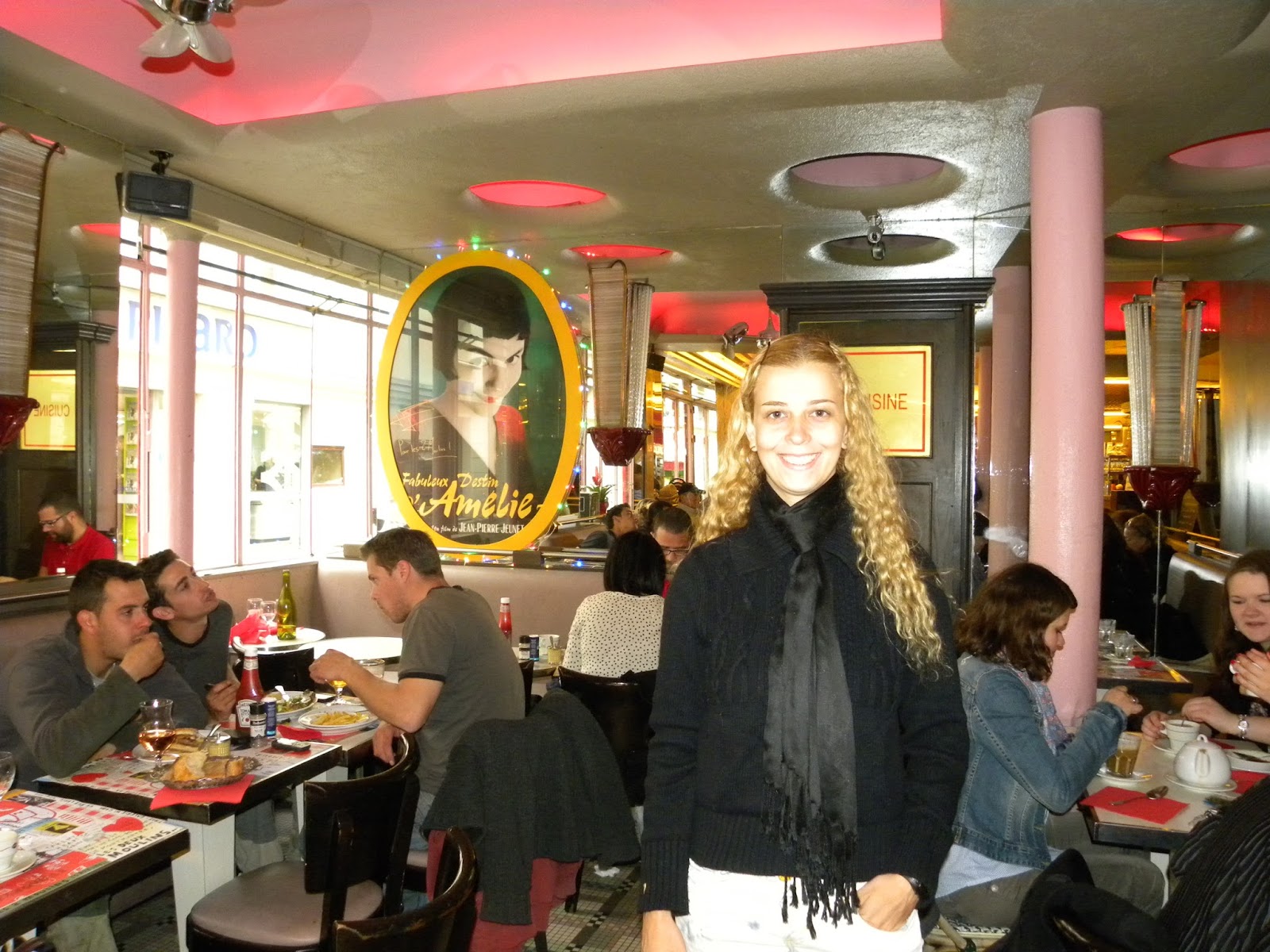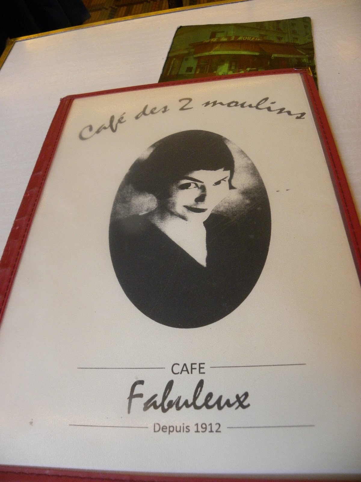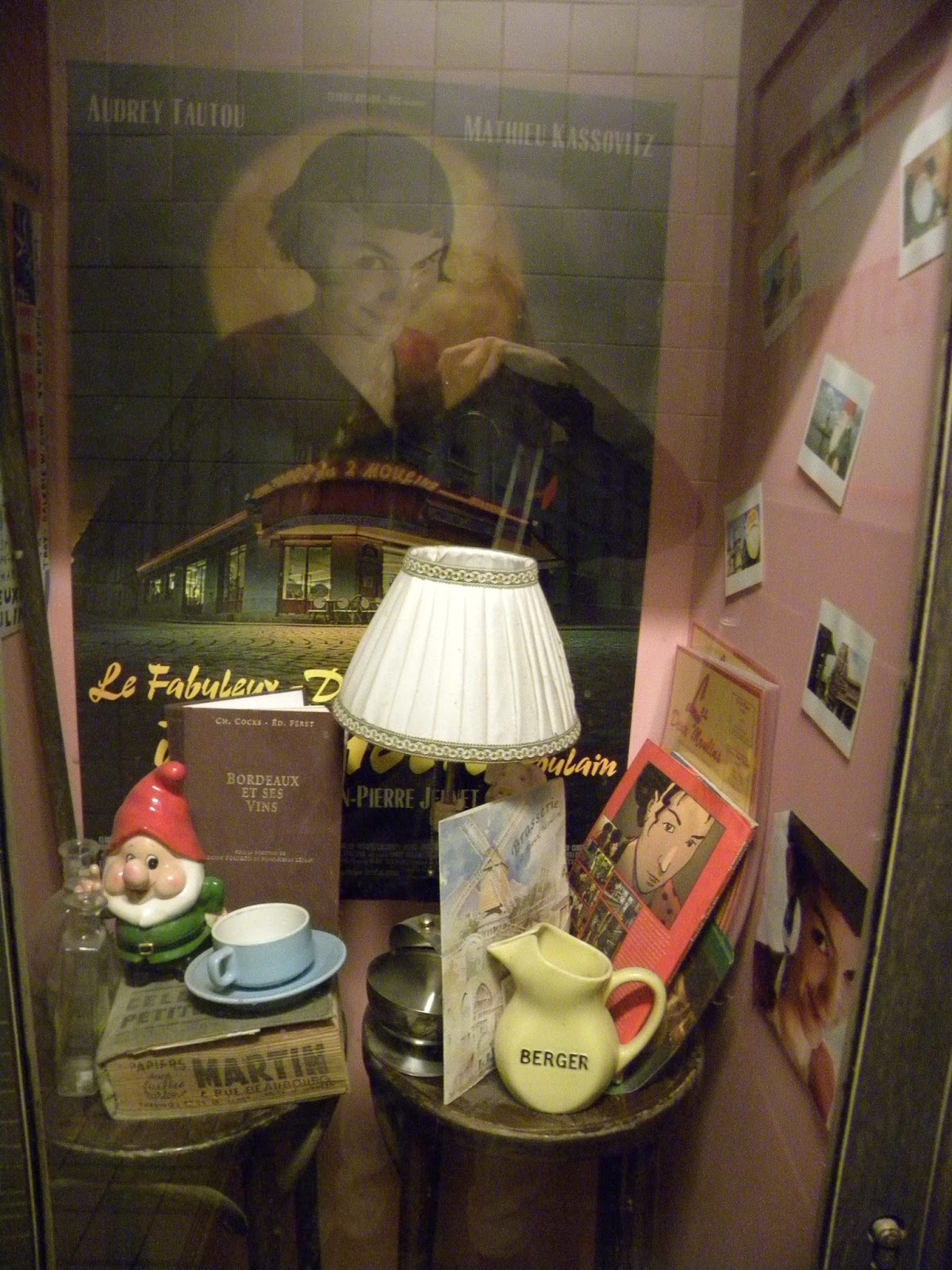Começou a chover e corri para me abrigar no restaurante Café des deux moulins. Vocês lembram do filme “O Fabuloso Destino de Amélie Poulain“? Amélie trabalhava nesse restaurante. Dizem que o local virou ponto de peregrinação dos amantes da obra cinematográfica. Tudo no interior do café lembra a película, seja o cardápio, o papel que cobre a mesa, o quadro. No caminho para o banheiro tem um “relicário”, contendo anão, poster, fotos, livros.