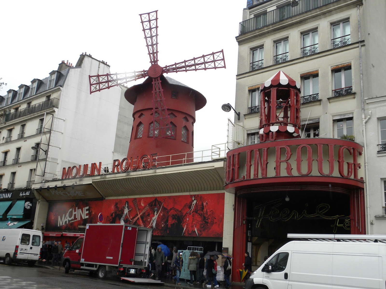 A poucos passos do café fica o famoso cabaré parisiense, Moulin Rouge. O prédio foi construído em 1889. Tem um grande moinho no terraço e é pintado de vermelho (por isso o nome é “moinho vermelho”). Novamente lembrei do filme homônimo, que é o meu musical predileto de todos os tempos, bem como dos desenhos do Lautrec.