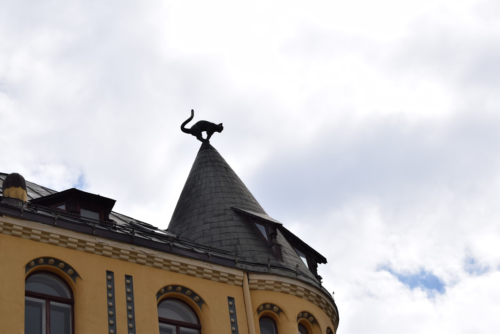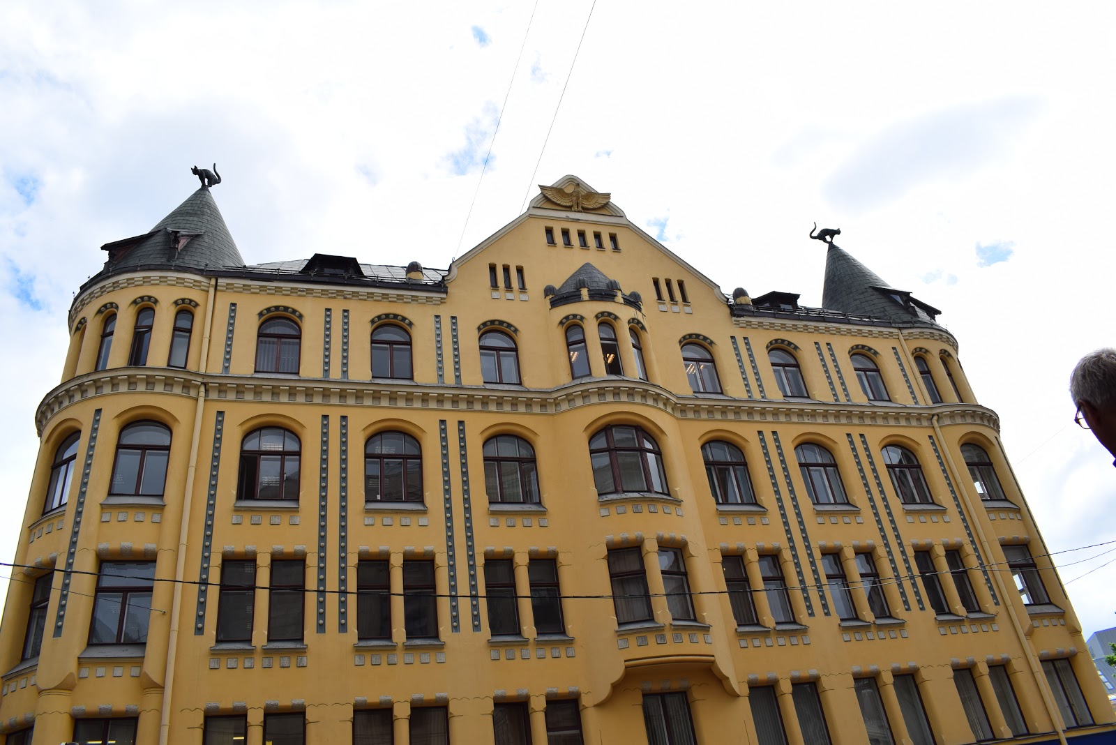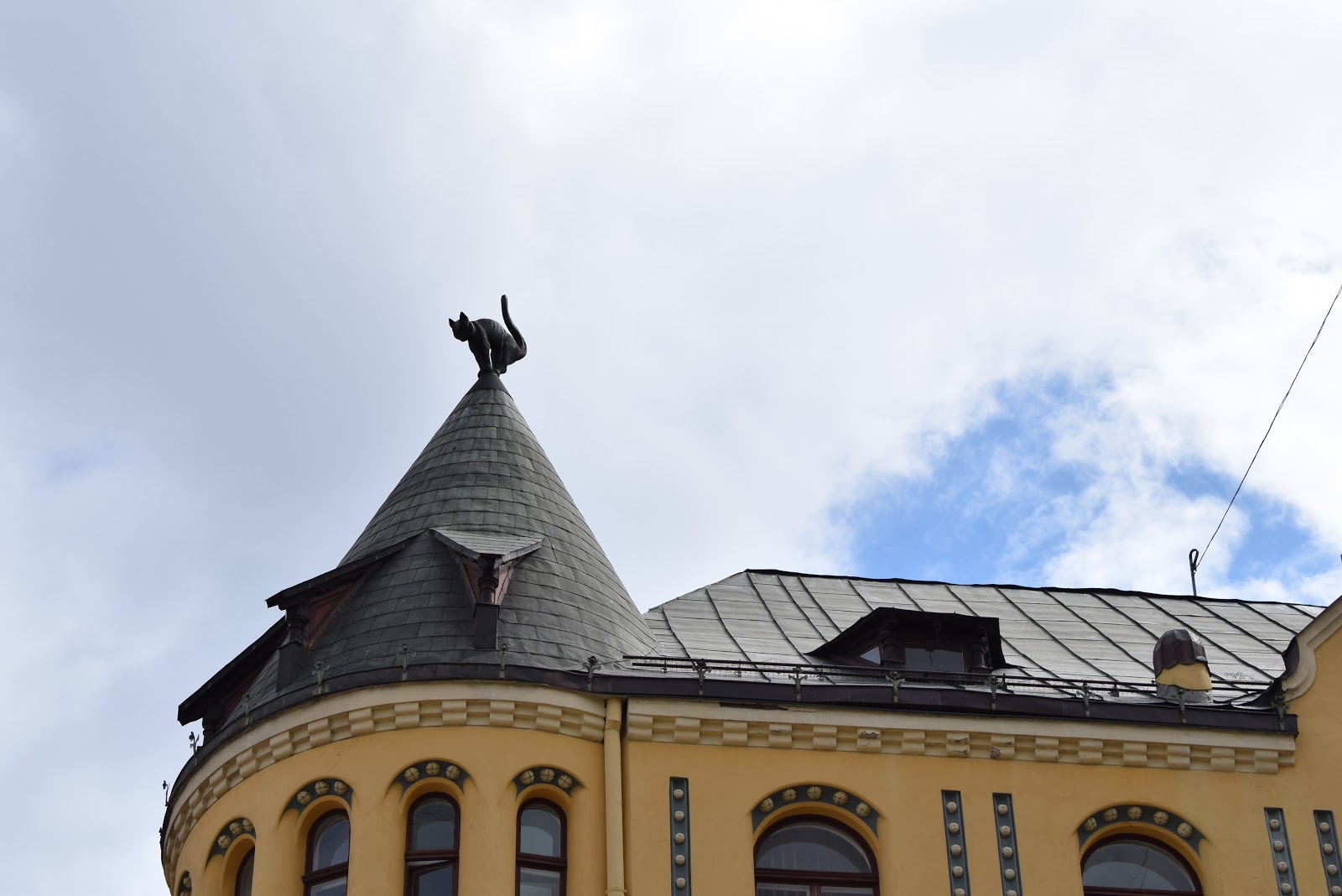 Passe pela escultura intitulada “Ghost” até chegar na famosa “Casa dos gatos” (The Cat house). A casa, construída em 1909, é famosa por ter dois gatos esculpidos no telhado, que acabaram se tornando símbolo de Riga.
