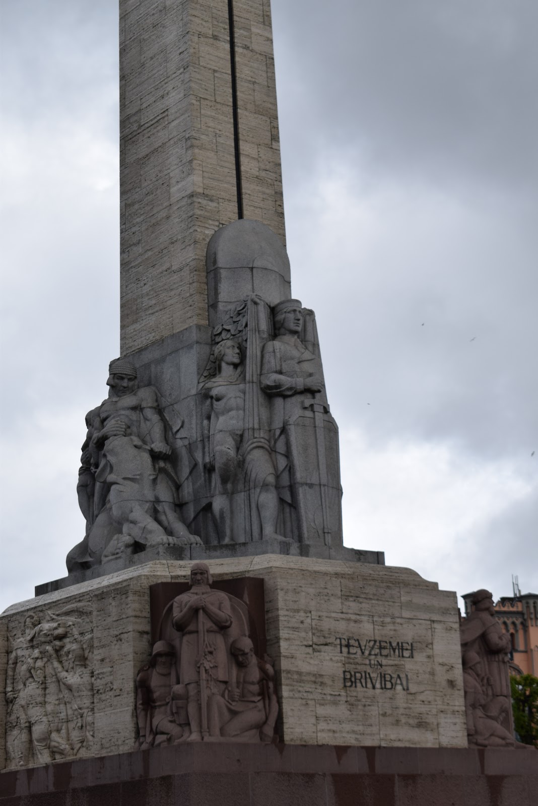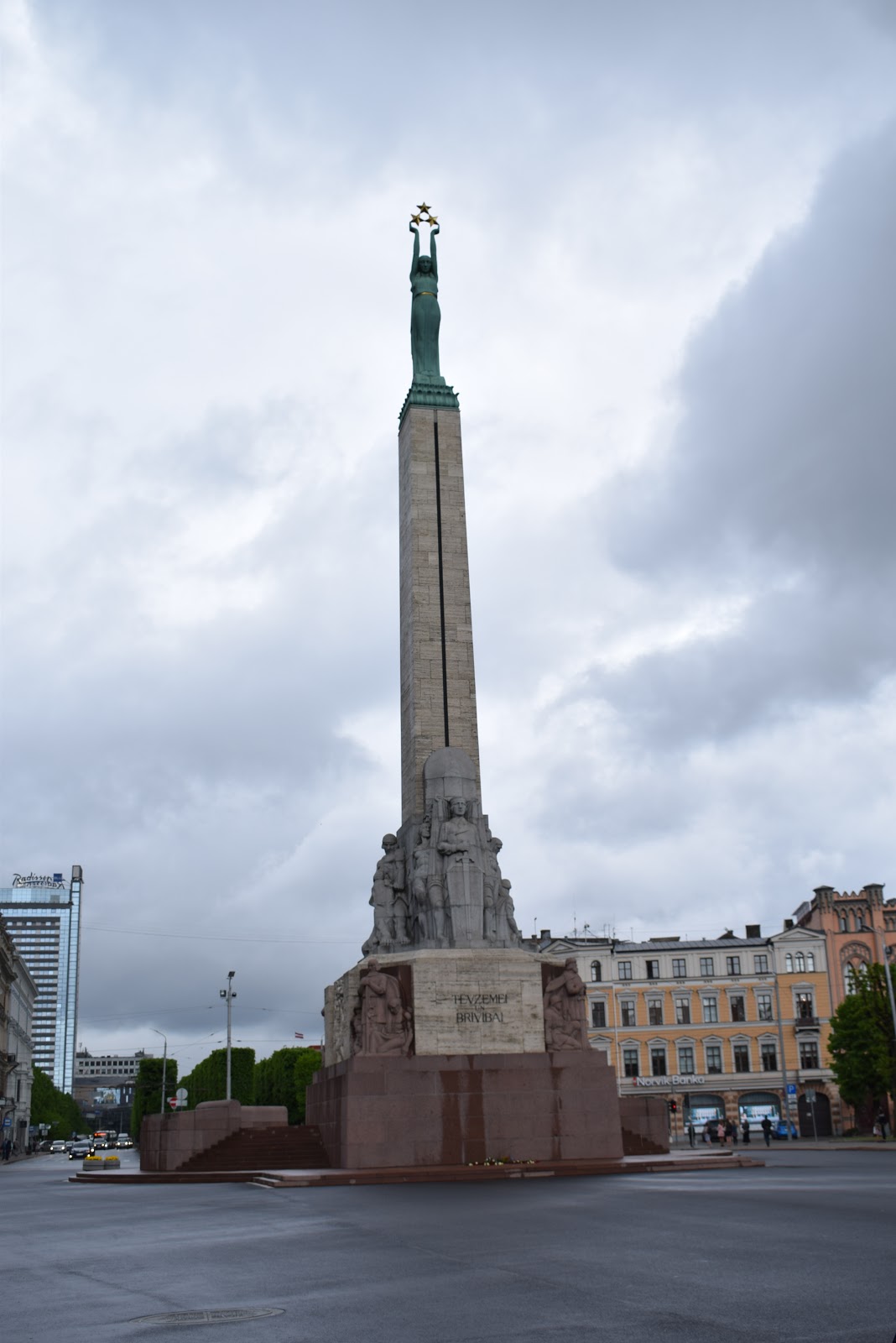 Posteriormente, caminhamos em direção ao Monumento da Liberdade: “The freedom monument“. A escultura de granito mede 42,7 metros e representa o Estado Letão, a unidade nacional, a independência e a liberdade. Foi financiado inteiramente por doação de moradores e construído como memorial para aqueles que morreram pela independência do país. No topo do obelisco tem uma mulher com três estrelas sobre a cabeça, que são províncias históricas da Letônia e a unidade nacional.