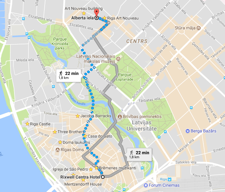 Depois de visitarmos cada ponto de Old Town, retornamos ao hotel para verificar a exata localização do bairro de Art Nouveau em Riga. A rua com a maior concentração de prédios é Alberta, que tem construções magníficas. Oito prédios foram reconhecidos como monumentos arquitetônicos.