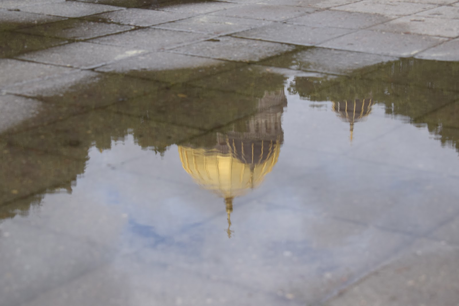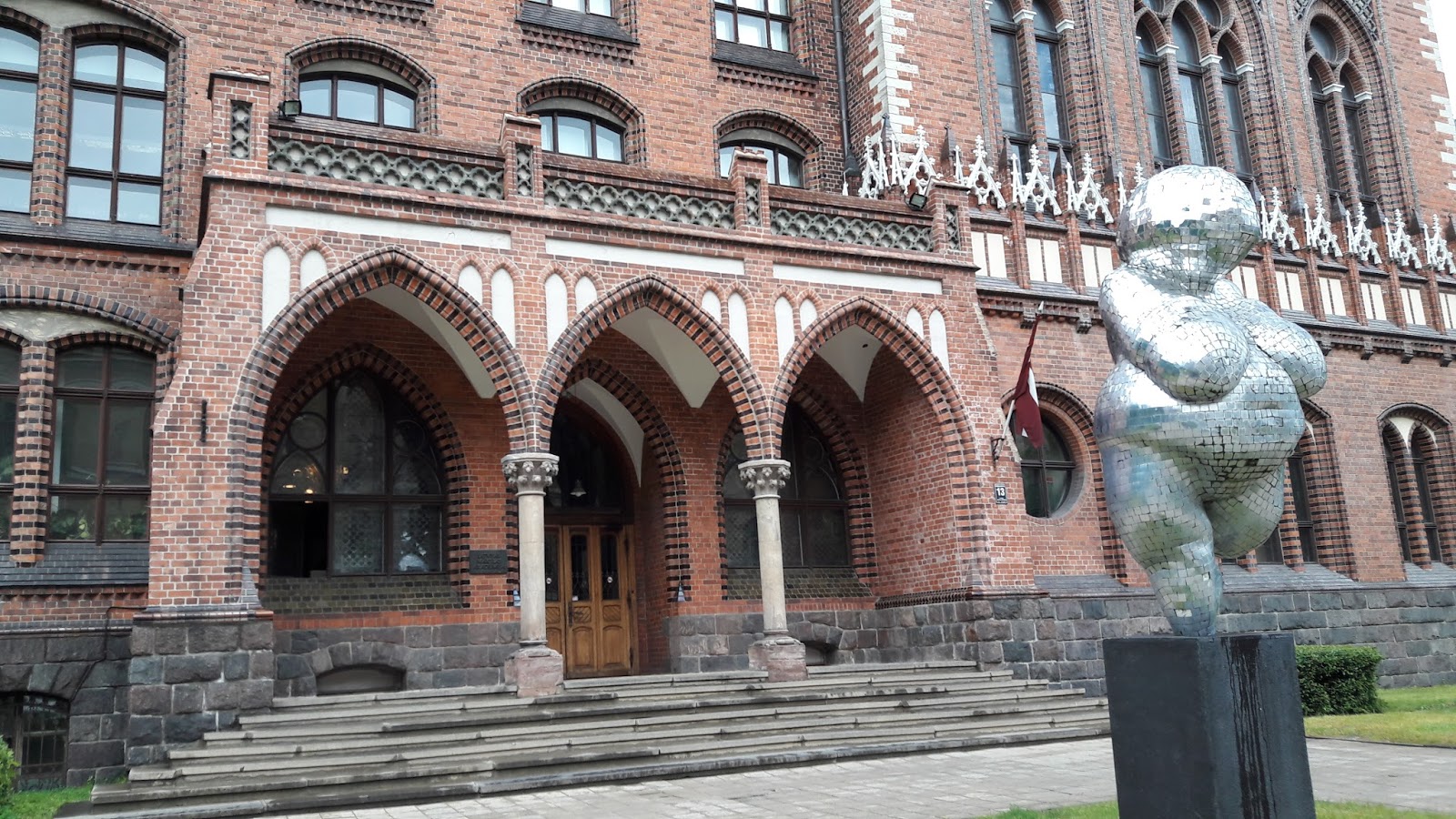 O primeiro “susto” é constatar que Riga é uma cidade grande! A maioria dos blogs que li antes da viagem só mostrava a Cidade Antiga (Old Town). Assim que saímos começou a chover torrencialmente. Estava com o guarda-chuva, mas não o suficiente para me abrigar. Aguardamos por algum momento no belo prédio da Academia de Artes da Letônia, que fica localizado no “Parque Esplanade”.