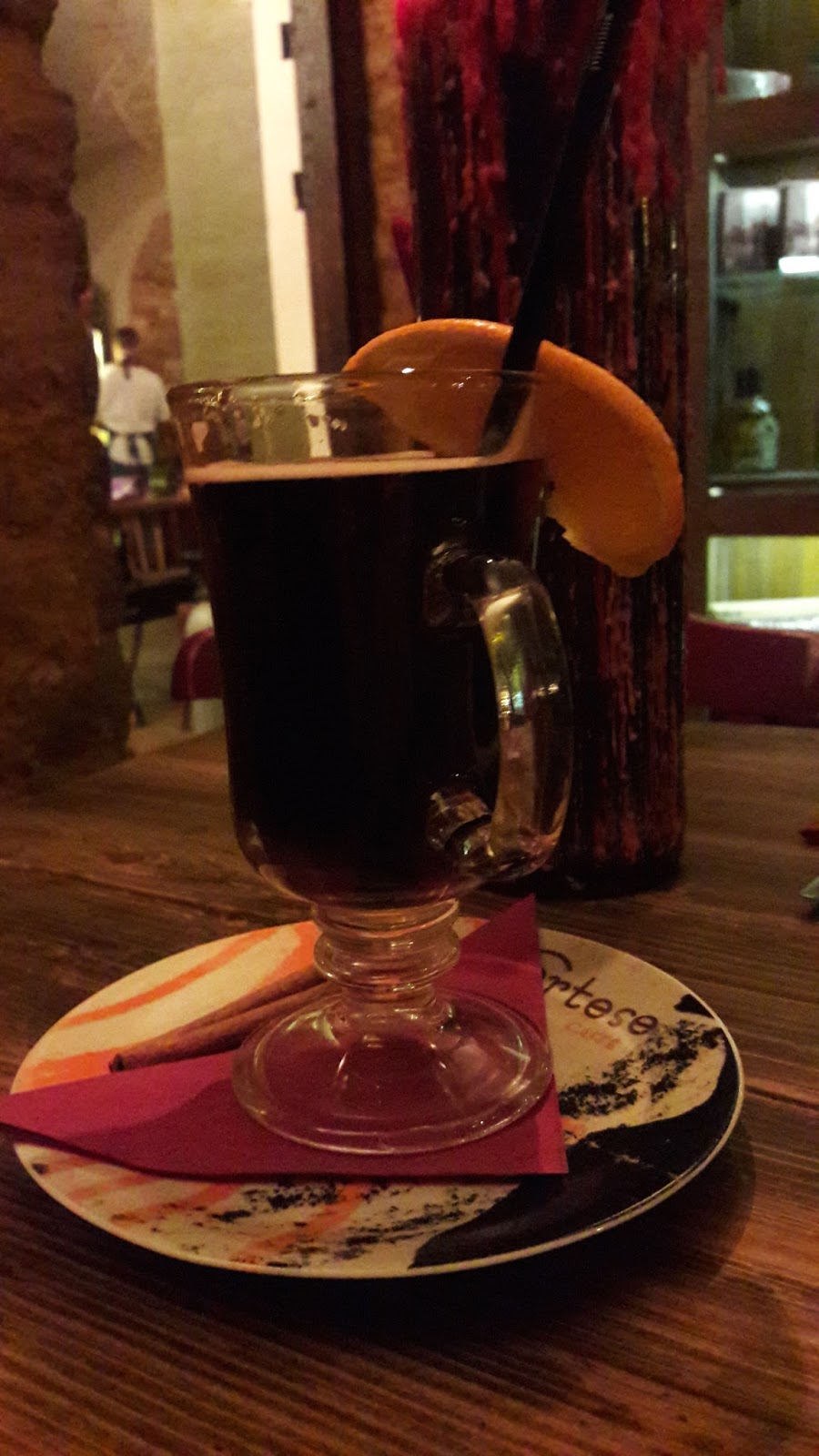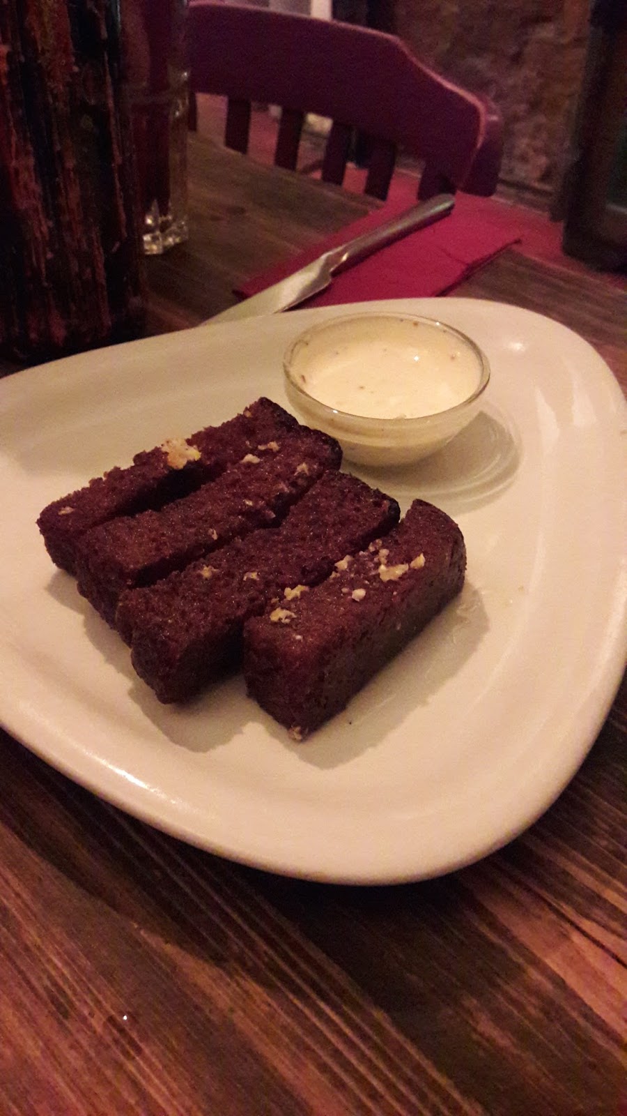 Como contado no primeiro post, comemos nos três dias no mesmo restaurante, o Folkklubs Ala Pagrabs. Em razão do frio, cheguei e pedi um vinho quente, que é temperado com anis-estrelado, laranja e canela. De entrada teve um delicioso pão preto com alho frito (Latvian garlic bread por 2 euros)! Meu prato principal foi “seasonal sauté pan” (5,90 euros), embora não costume comer carne, fiz a opção por essa panela de batatas, carne, cenoura, cogumelos, repolho coberto com queijo gratinado e servido com um pão fresco de alho. Comida deliciosa!