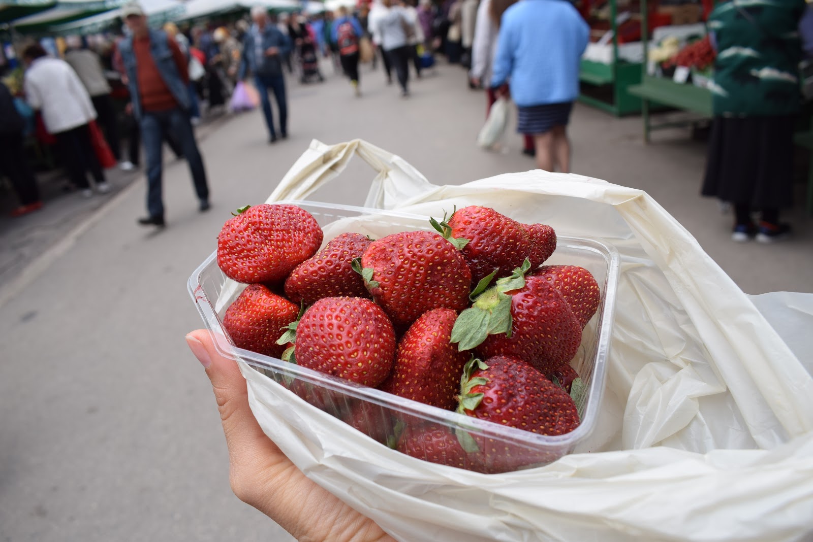 Você pensa que acabou? Do lado de fora tem uma feira que deve ser maior que o mercado. Encontramos peixes, carnes, condimentos, roupas, bolsas, flores, frutas, vegetais. Tudo o que podemos imaginar. Meu amigo aproveitou para comprar uma mochila. Sou louca por frutas e comprei meio quilo de morango por 80 centavos de euro! Pra pedir meio quilo mostrei a mão e dividi com a outra. A vendedora, que não falava inglês, entendeu.