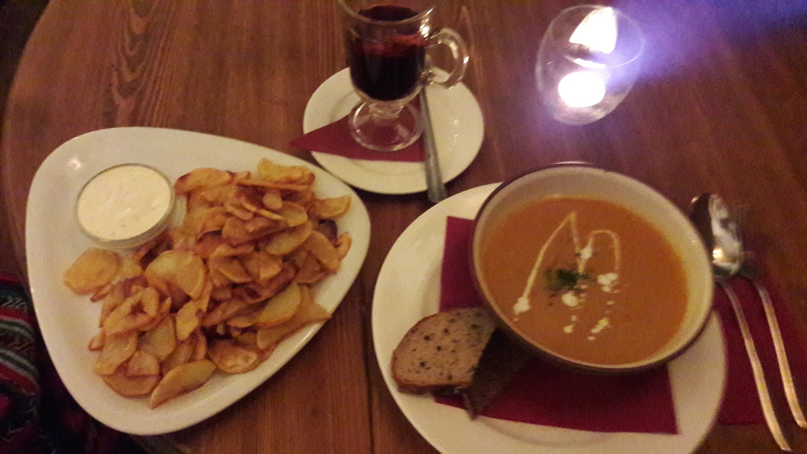 Na hora do almoço, seguimos para o restaurante Folkklubs Ala Pagrabs. Dessa vez pedi a sopa do dia, que era de abóbora (1,50 euros). Meu amigo exclamou “Não acredito que vai almoçar com menos de 5 reais!”, mas depois pedi uma porção de batata frita que vem com um molho delicioso (2 euros) e um vinho quente.