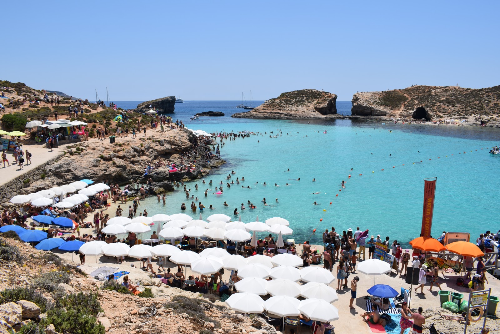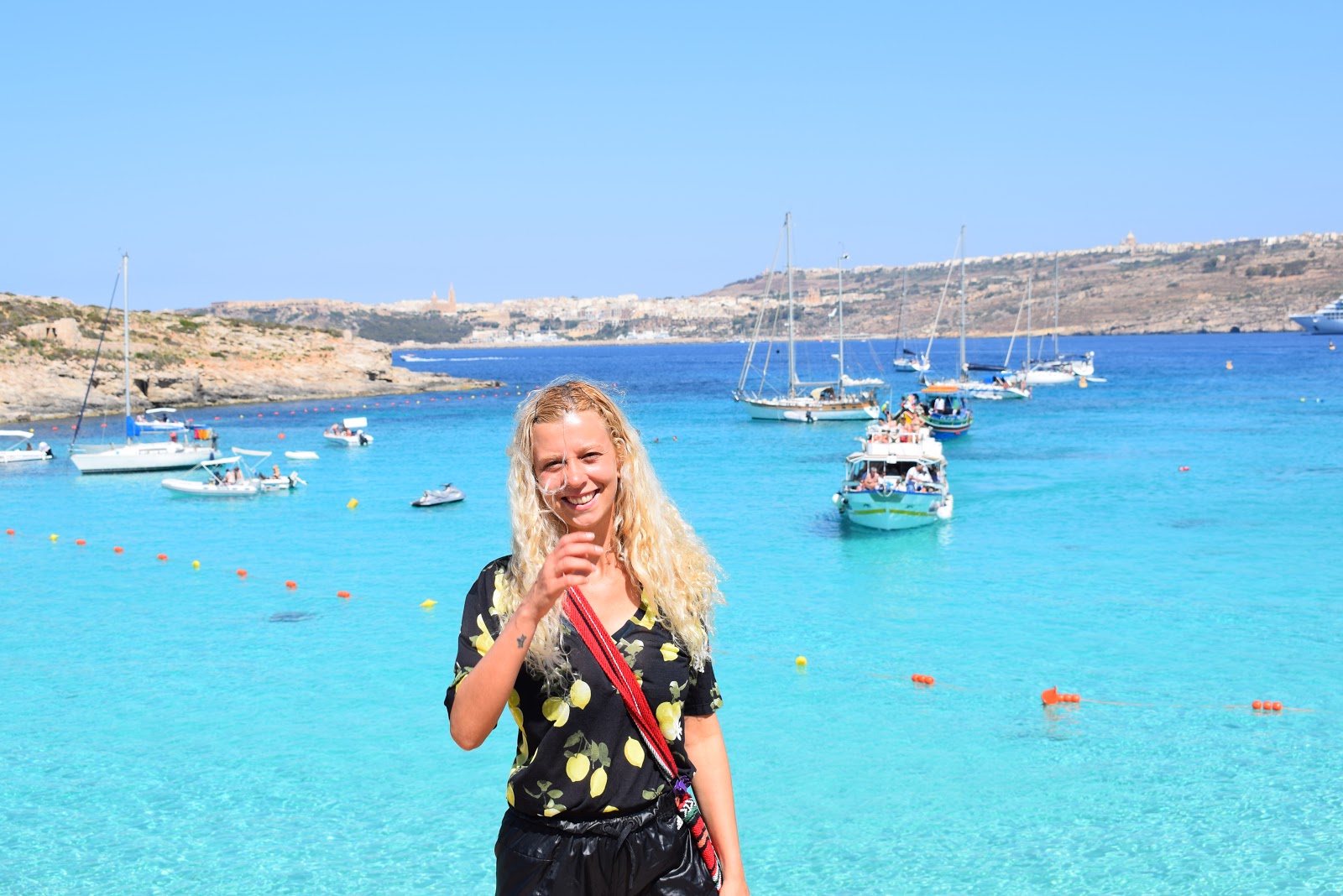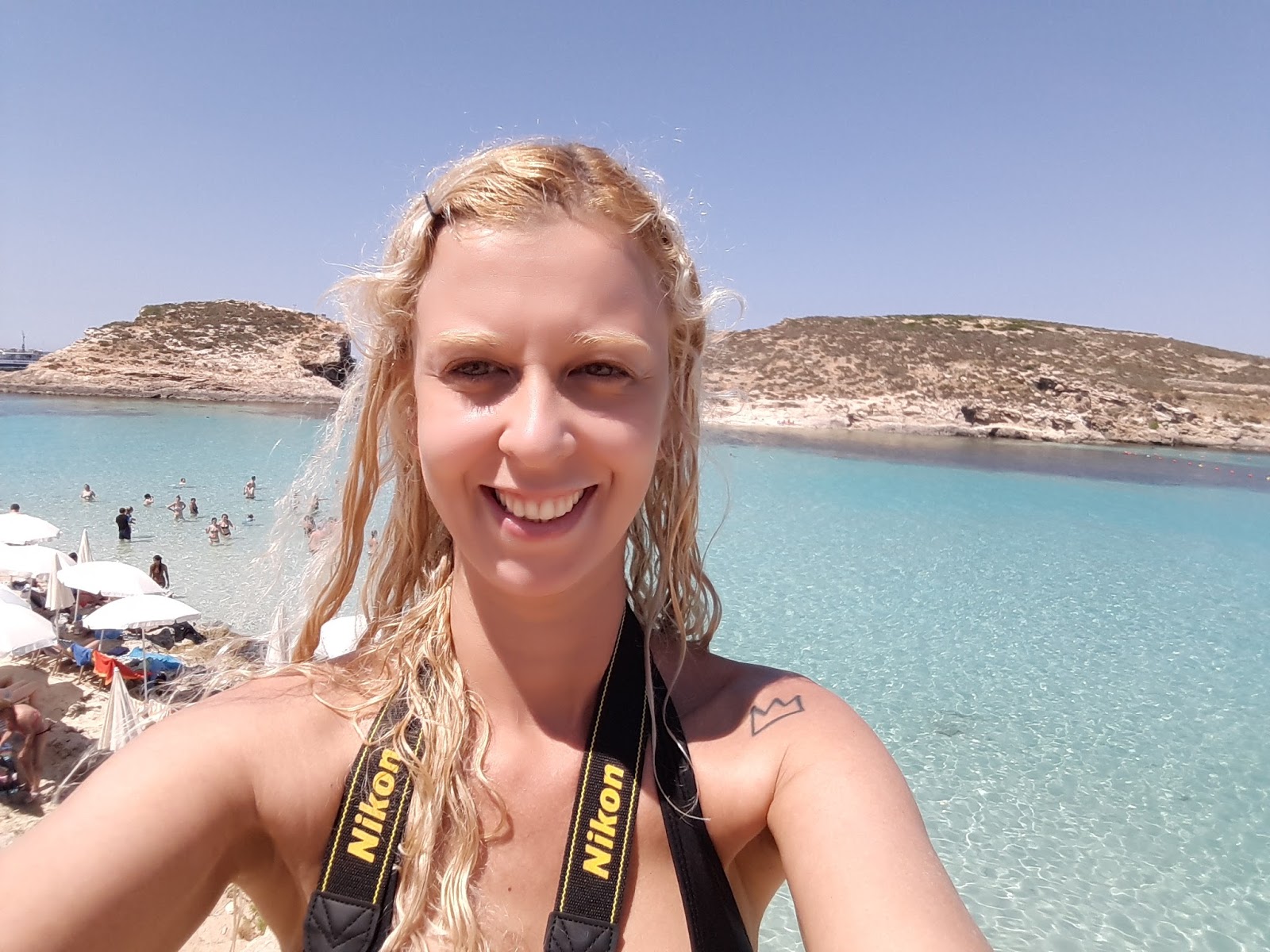 A chegada é impactante, pois nos deparamos com um tom de azul maravilhoso. Caminhamos para ver o que a ilha tinha a oferecer e concluímos que a praia praticamente não tem faixa de areia. A pequena extensão de areia estava coberta por cadeiras e o custo era de 20 euros por pessoa, em média. De repente, observei que tinha um espaço sobre uma pedra ainda na areia e coloquei minha toalha – me considerei sortuda.