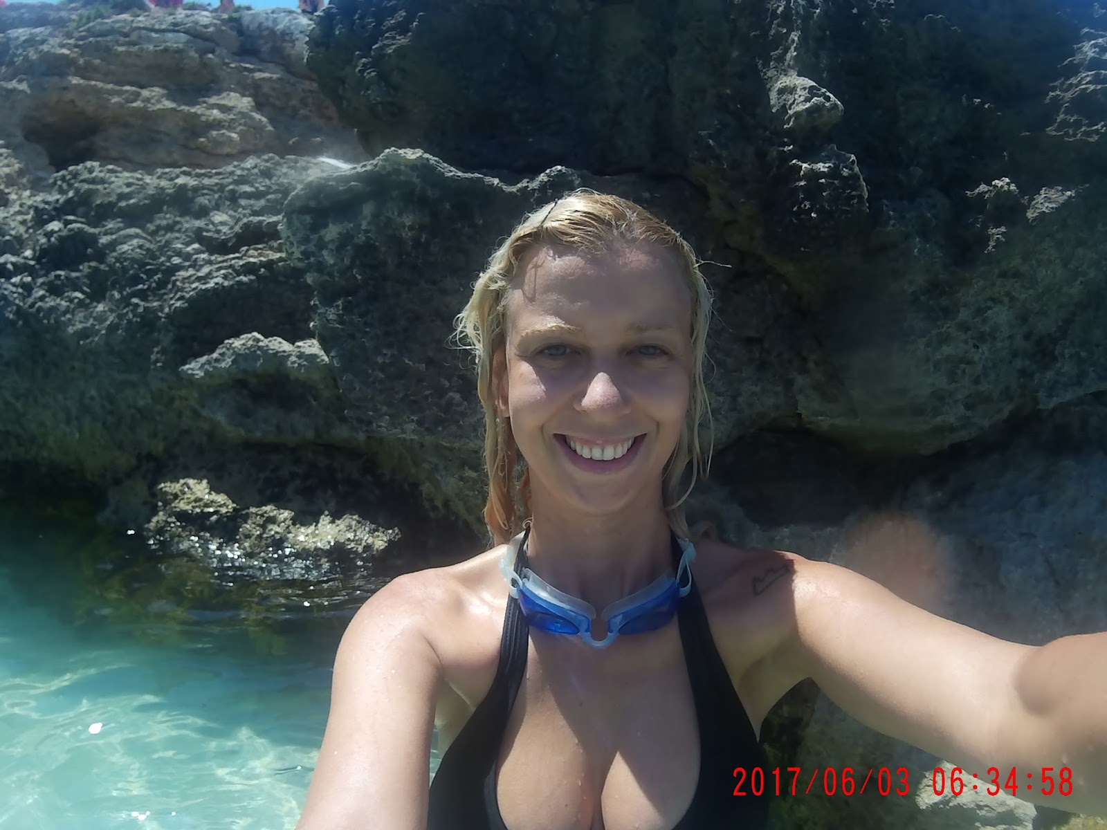 Ao olhar para a praia, do alto, me assustei com a quantidade de pessoas! Já passava de 13h e o local tinha lotação máxima! Ao retornar, meu amigo atravessou a “lagoa azul” nadando e voltou completamente vermelho, pois não levou protetor solar.