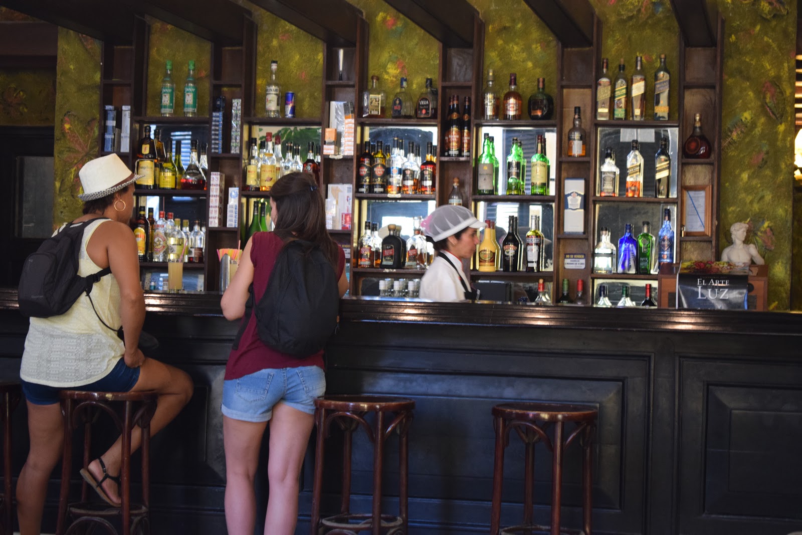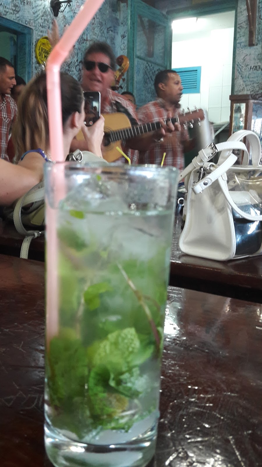O primeiro andar está sempre lotado e as pessoas se espalham pelas ruas ou se espremem no salão, mas tem outros andares mais vazios. Então seguimos até o terceiro andar. Cada ambiente tem um nome e é decorado com fotos de pessoas importantes que já visitaram o lugar, camisas, assinaturas. Sentamos, pedimos o mojito (6 CUC) e ficamos aproveitando o grupo que tocava músicas latinas.