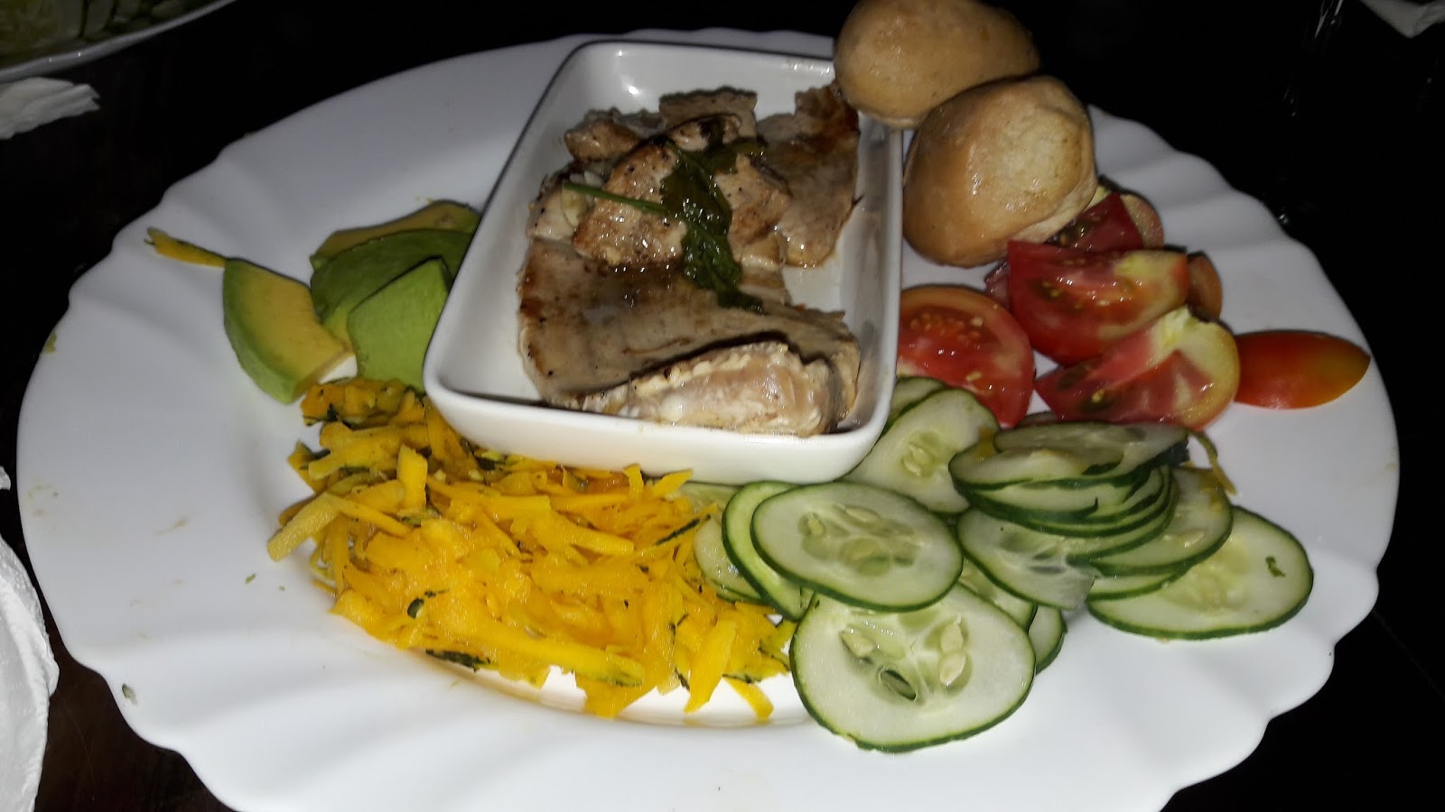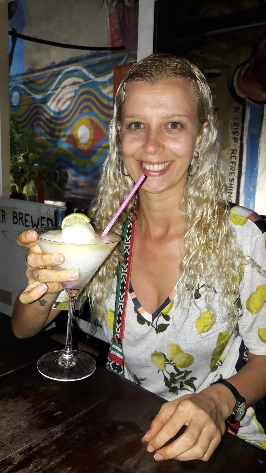 A fila era basicamente formada por turistas. O restaurante tem 3 andares. O terraço parece ser mais animado, contudo, fomos conduzidos ao segundo andar. O garçom perguntou se nos incomodávamos em dividir a mesa, mas não nos importamos. Era um casal de canadenses, aparentemente pai e filha. Ajudamos os dois a selecionar o que comeriam, pois a menina era vegana! Não tinha qualquer opção vegana no restaurante. Pedi um pescado (6 CUC) com um Daiquiri (5 CUC), enquanto Guilherme pediu “Ropa Vieja“, que é o prato típico de Cuba, que consiste em uma carne assada desfiada.