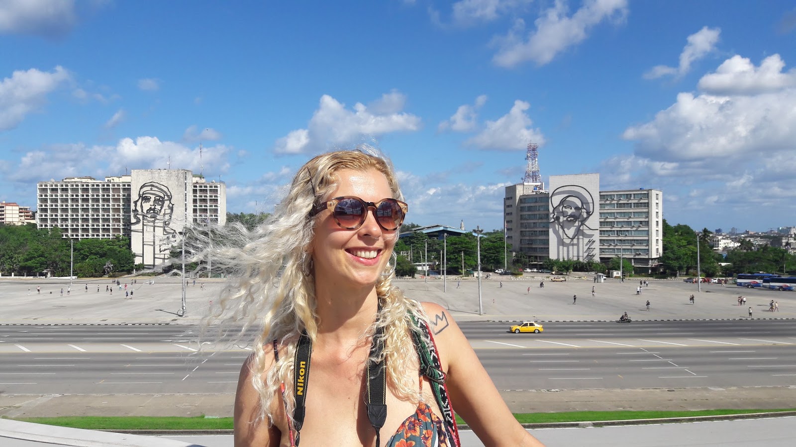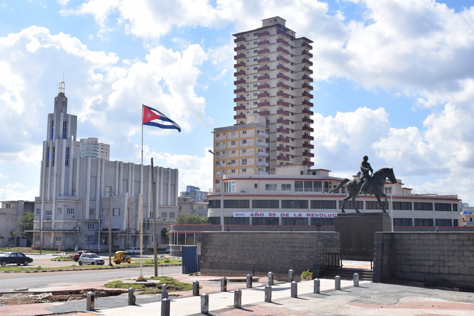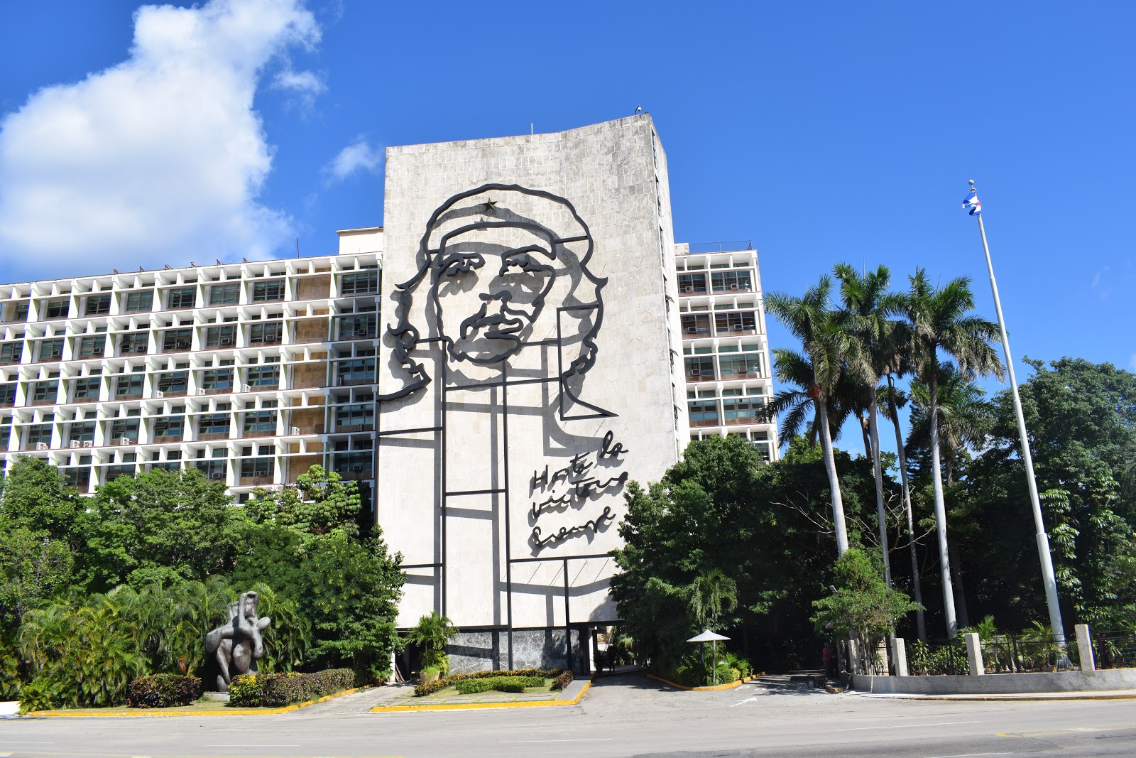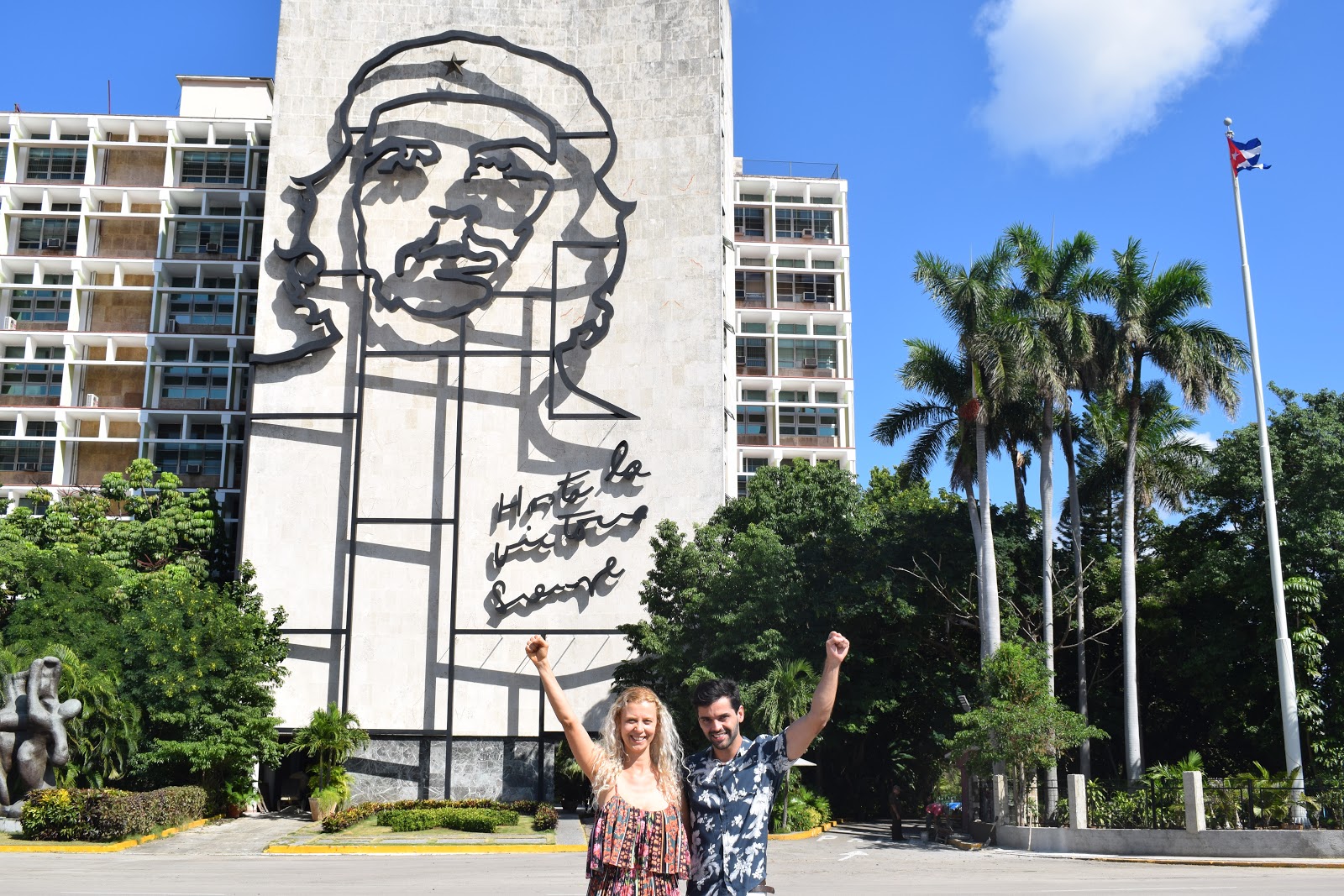 Descemos na Plaza de la Revolución, famosa por ser o centro de manifestações políticas e culturais em Cuba. Obra do francês Jean Claude Forestier em 1920, é uma das maiores praças do mundo com seus 72 m2. Até 1959 era conhecida como Plaza Cívica. Na fachada do prédio de cimento do “Ministerio del Interior” fica o mural de dois revolucionários que encantam os turistas: Che Guevara e Camilo Cienfuegos. A de Che é a réplica de uma foto tirada por Alberto Korda em 1960, que tem a inscrição “Hasta la victoria siempre“. No centro da praza fica o Memorial José Martí.