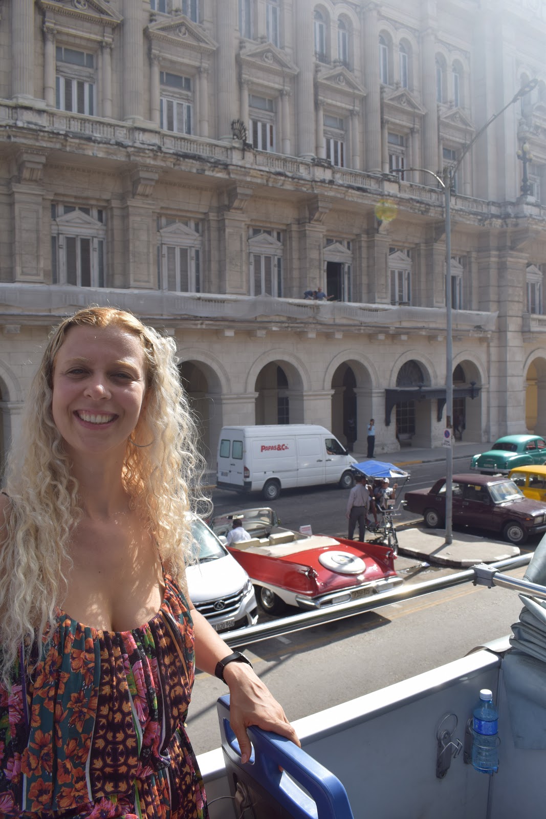 O dia estava ensolarado, mas preferimos ficar na parte superior do ônibus de dois andares. Normalmente não gosto de fazer tour nesses ônibus, mas em Havana acho uma opção cômoda. O ônibus segue pela orla, com vista do Malecón, passa por Vedado até Novo Vedado.