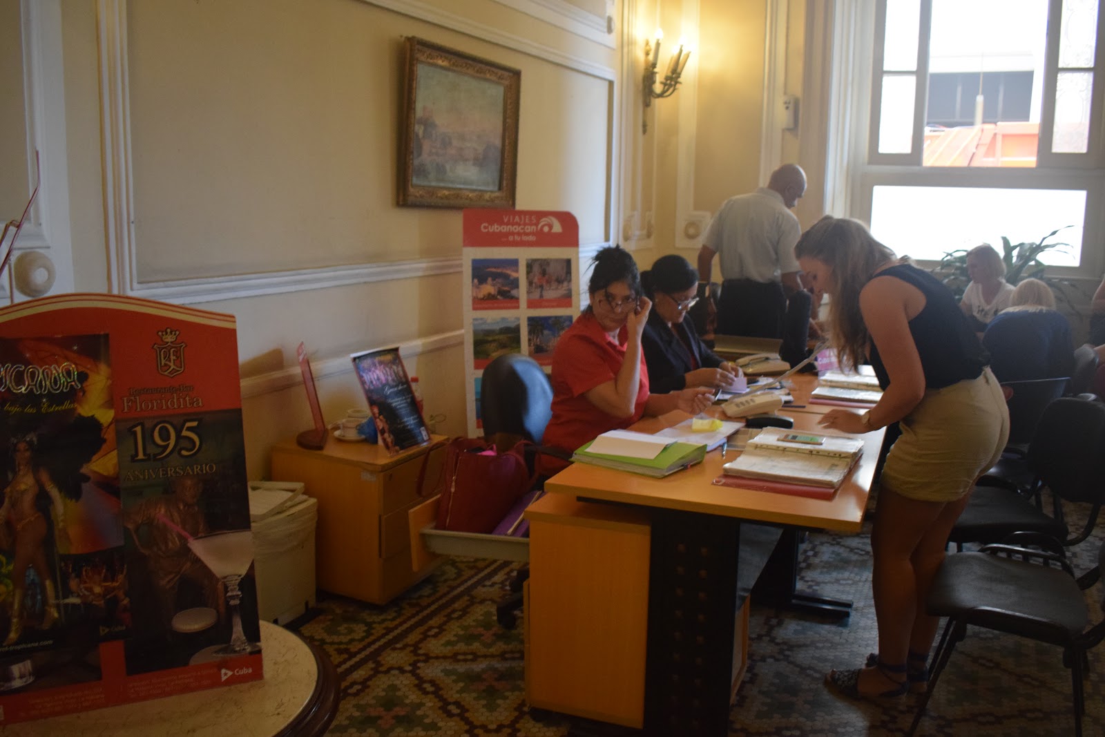 No café da manhã perguntei para a responsável pelo hostal naquele dia (cada dia é uma pessoa) onde poderia contratar um transfer para Varadero. Escreveu no papel o nome de dois hotéis, pela proximidade, seguimos para o Hotel Plaza. Pensamos que no dia seguinte estaríamos com as malas. No hall do hotel funciona a agência Cubanacan. Perguntei sobre o transfer para Varadero, disse que tinha disponibilidade e custava 25 euros. A saída seria ali mesmo, no dia seguinte, às 9 horas. Não recebemos qualquer recibo e tudo é registrado num caderninho com letras cursivas.