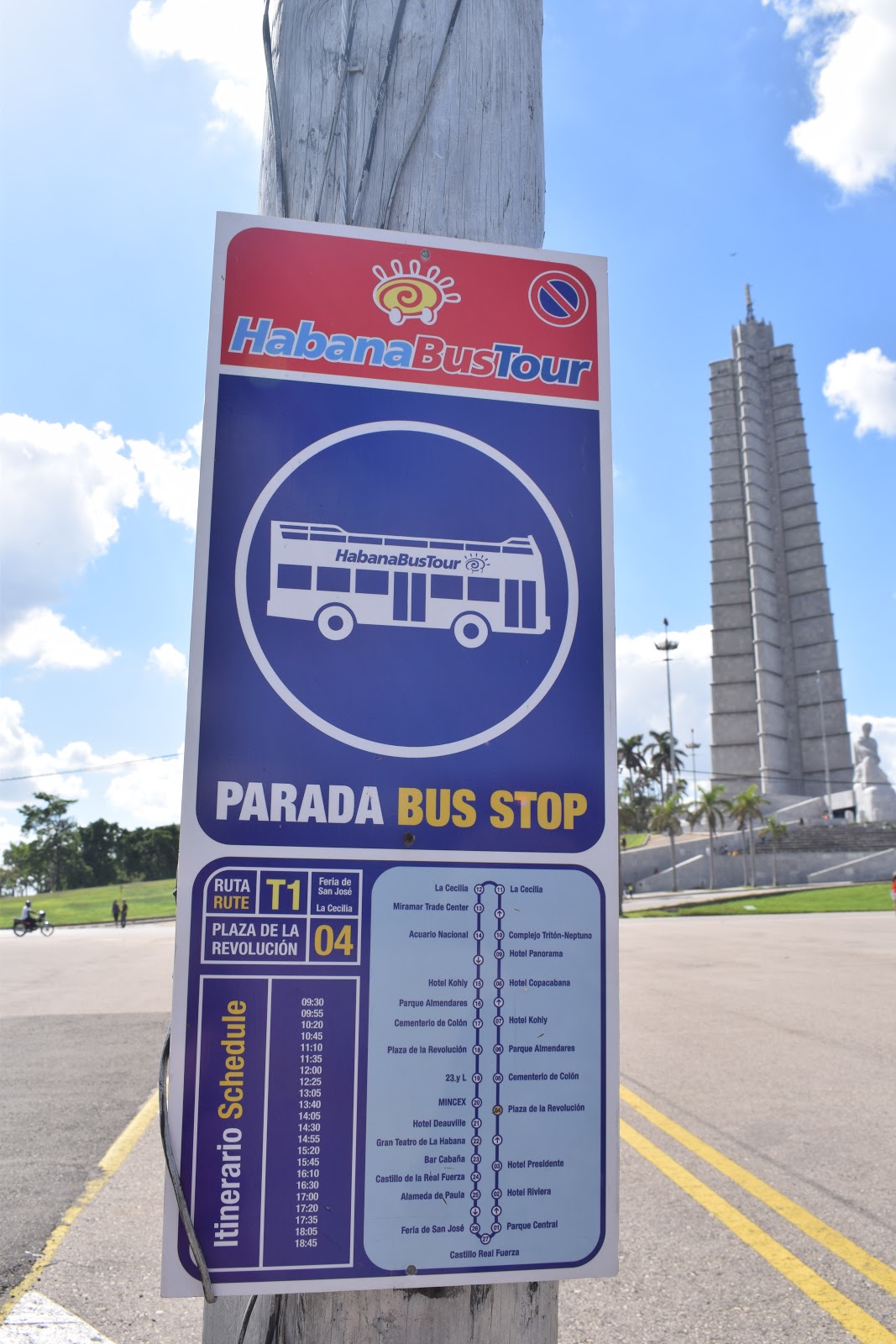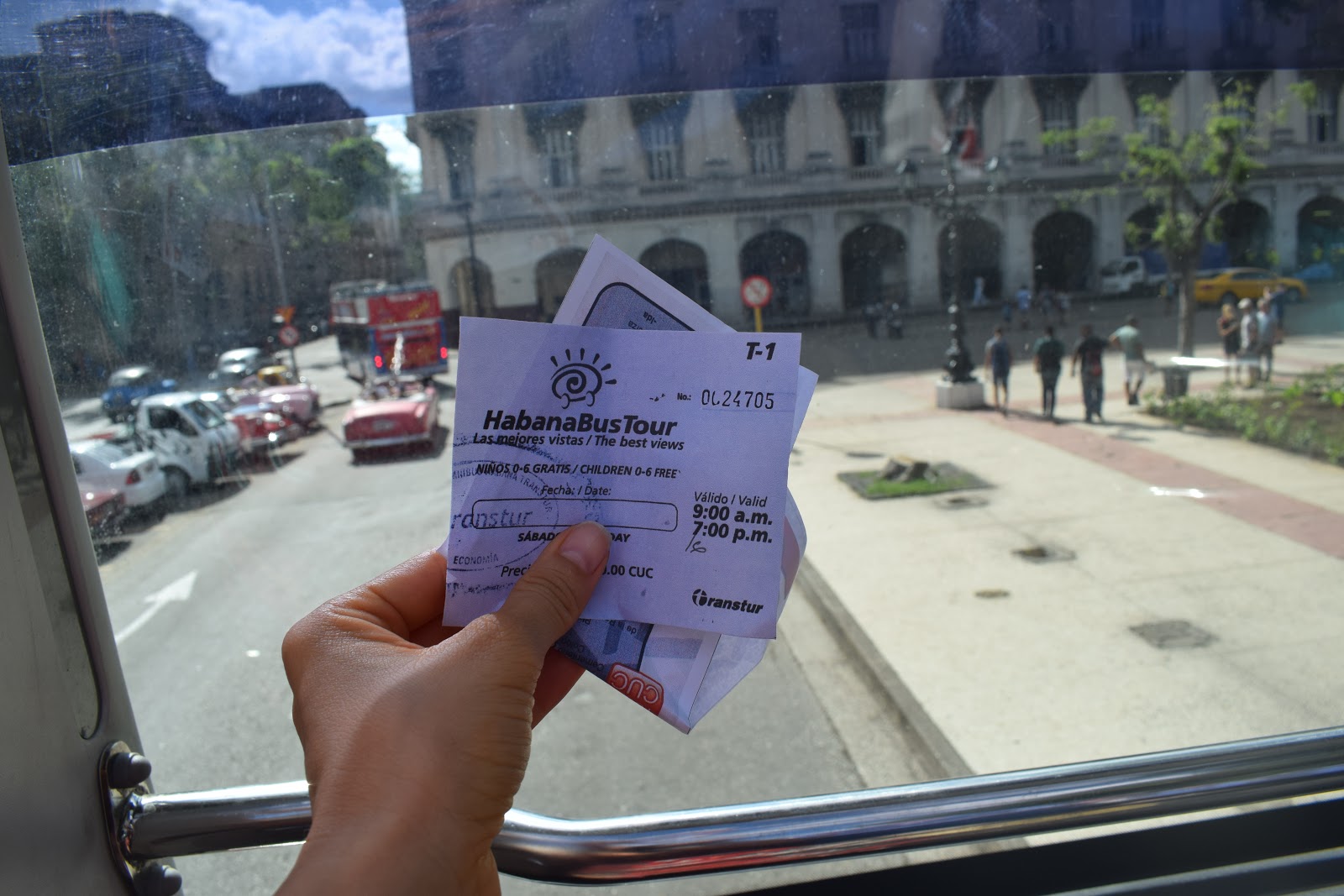 Decidimos pegar o “HabanaBusTour” no Parque Central, que funciona de 9 da manhã às 19h. O passageiro pode descer e voltar em qualquer ponto turístico e depois pegar o ônibus seguinte. O tíquete custou 10 CUC. Nosso objetivo era descer na “Plaza de la Revolución”, no bairro “Vedado”, que é distante para ir caminhando.