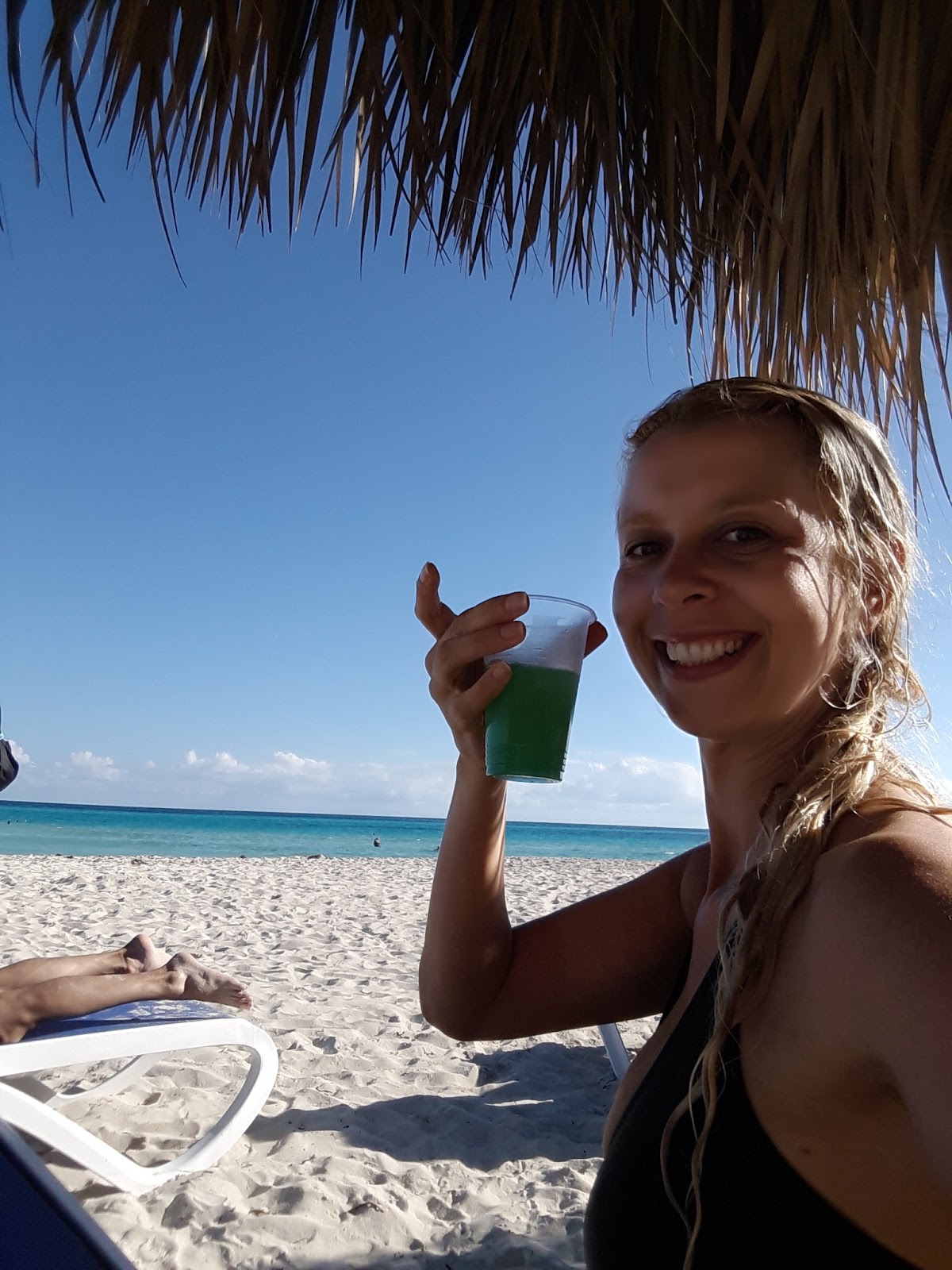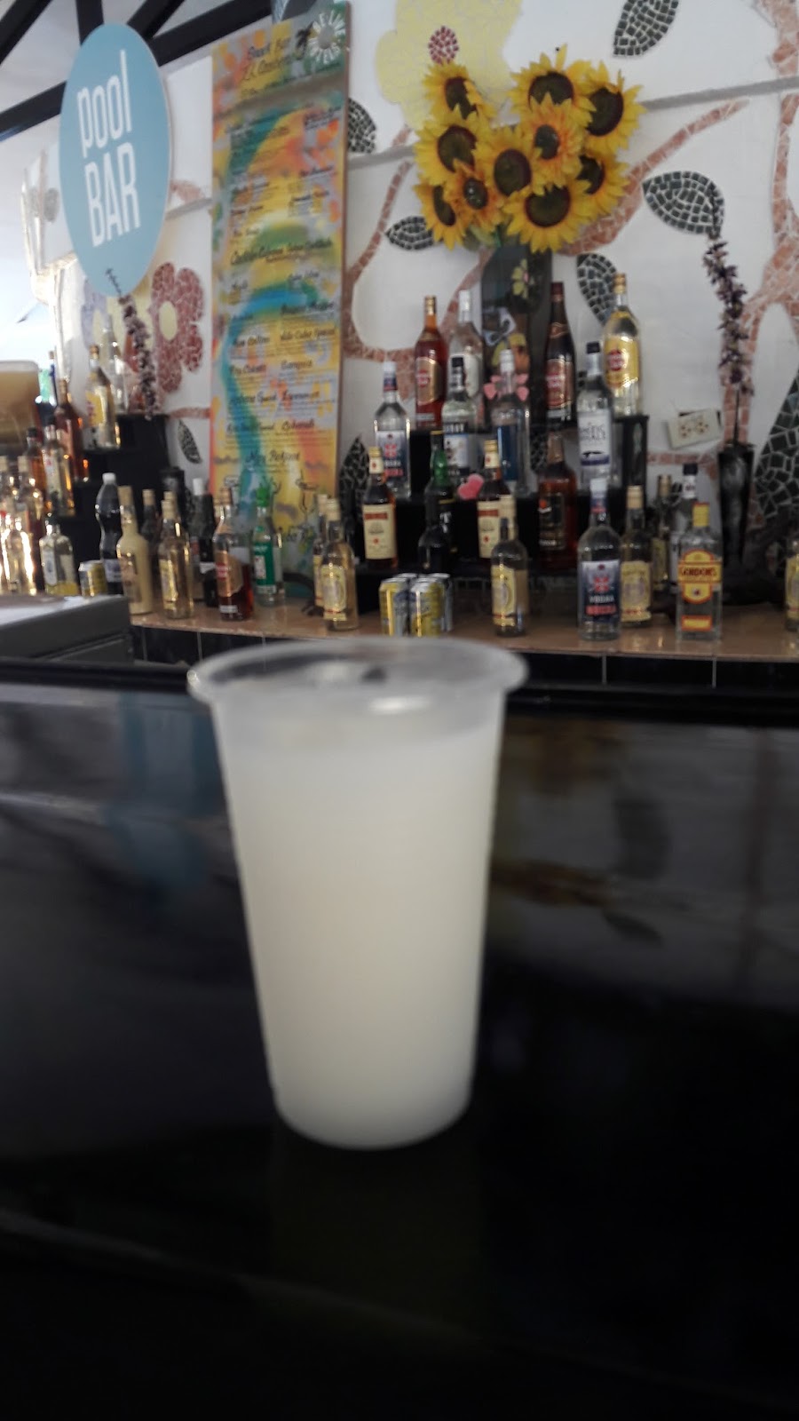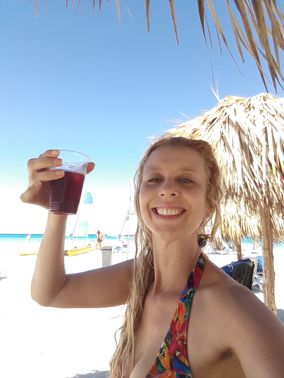 Descansamos um pouco e voltamos para a praia, agora sem mochila. Entrei na água, tomei alguns drinks. A bebida é resultado de uma mistura de um licor nacional e rum, mas é bem fraco e servido no copo de plástico. Vi alguns hóspedes com suas canecas grandes de acrílico que comportavam 1 litro, assim não precisavam ir ao bar toda hora.