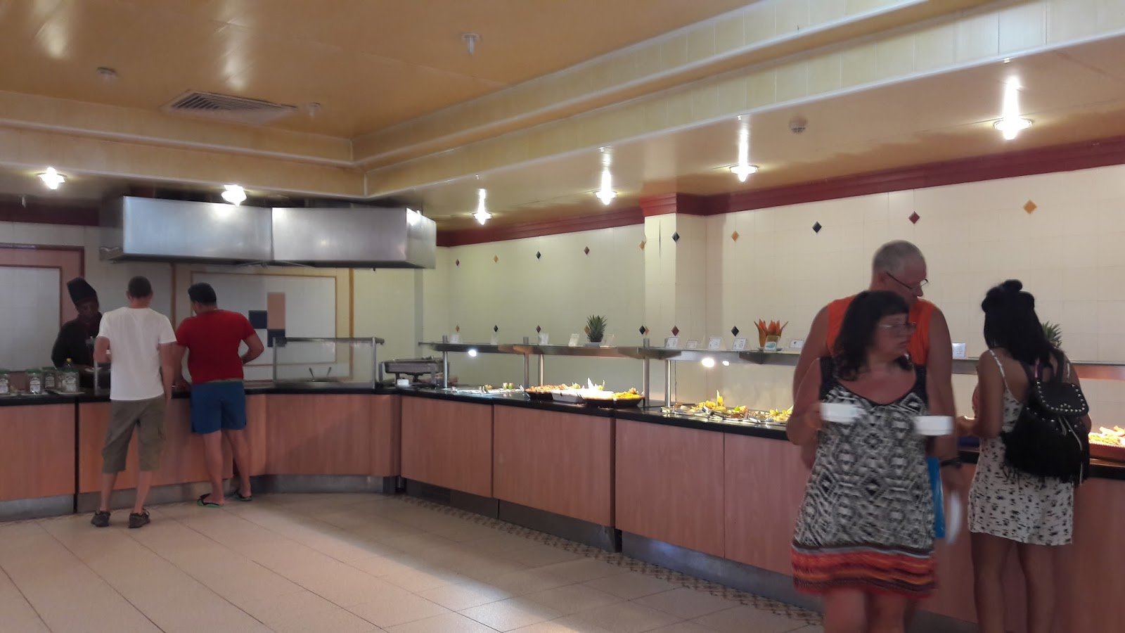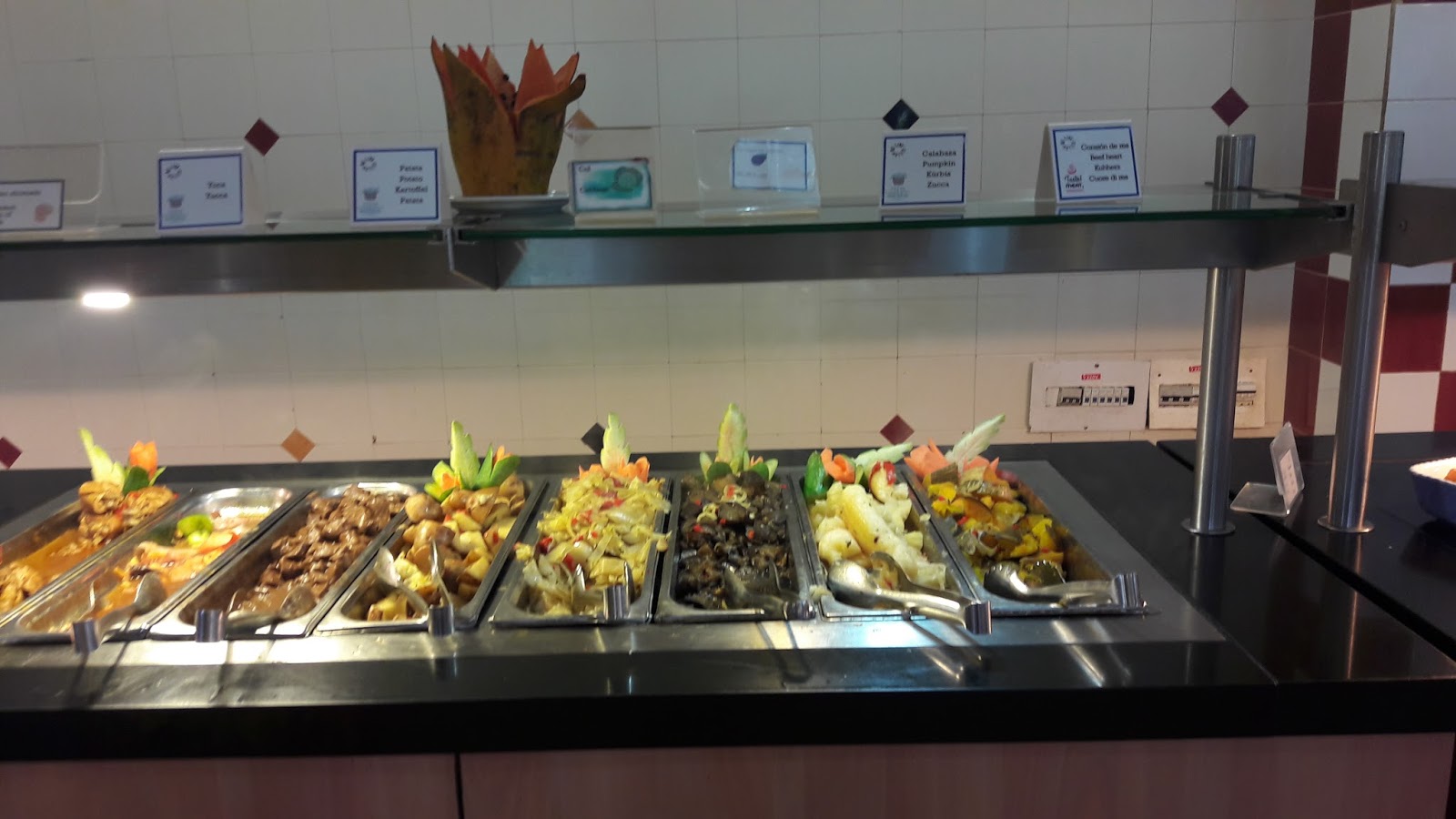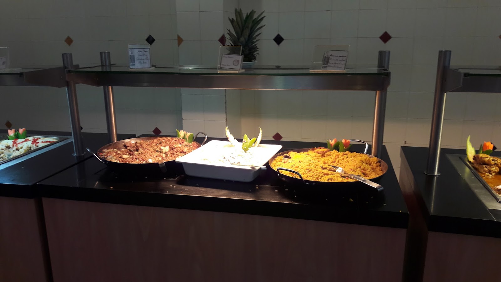 Estava apreensiva com a comida servida, mas almoçamos no restaurante principal (Las Dalias) e não tenho do que reclamar. Embora a comida não seja tão saborosa, tinha um leque com muitas opções. Diversas ilhas de comidas. Optei pelos alimentos feitos na hora. Tinha a opção de peixe, frango, porco, que era colocado na chapa na hora. Além de massa feita na hora. Muitos vegetais, sobremesas, pães, queijos, pizzas, sorvetes. Máquina de refrigerante local. Máquina de cappuccino. Os garçons eram muito simpáticos e o ambiente estava sempre limpo.
