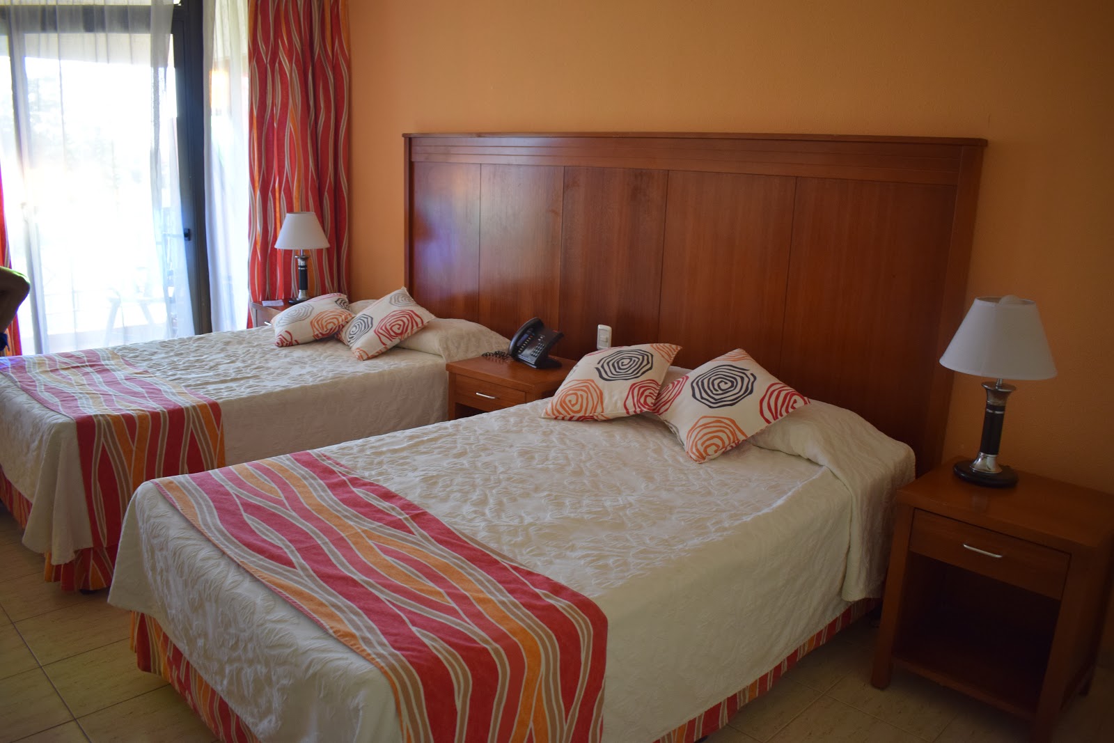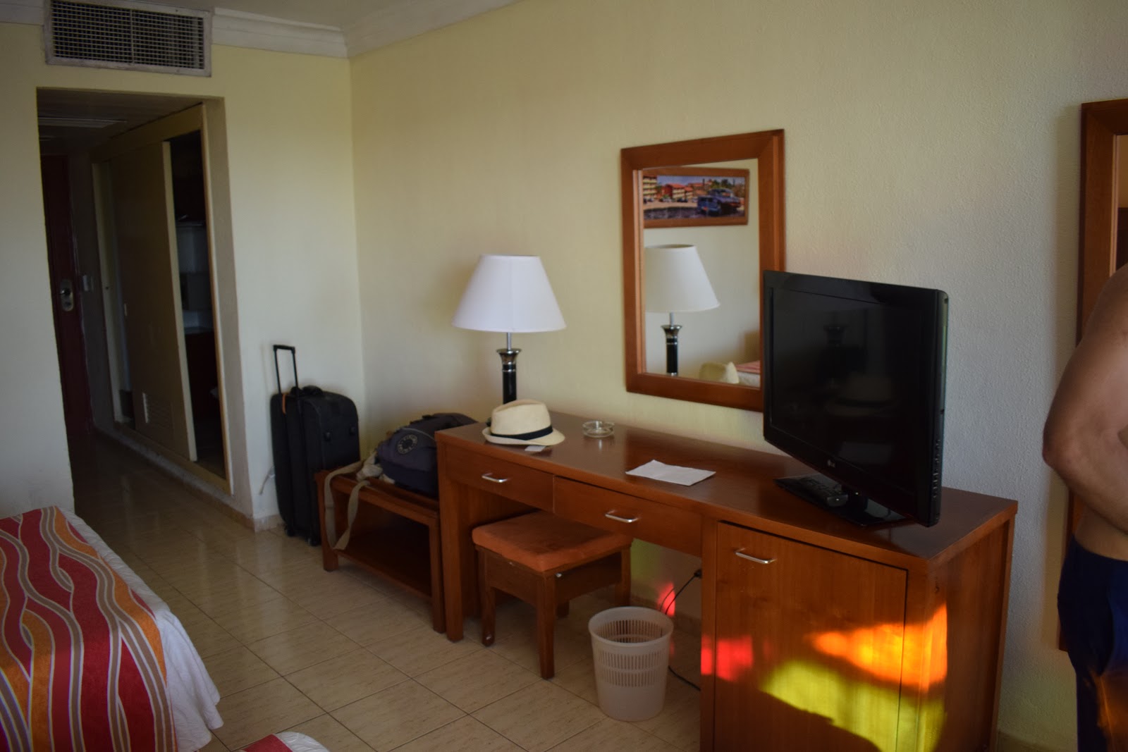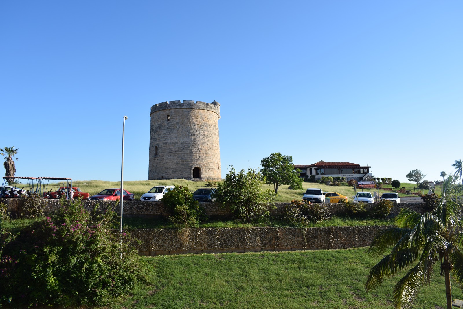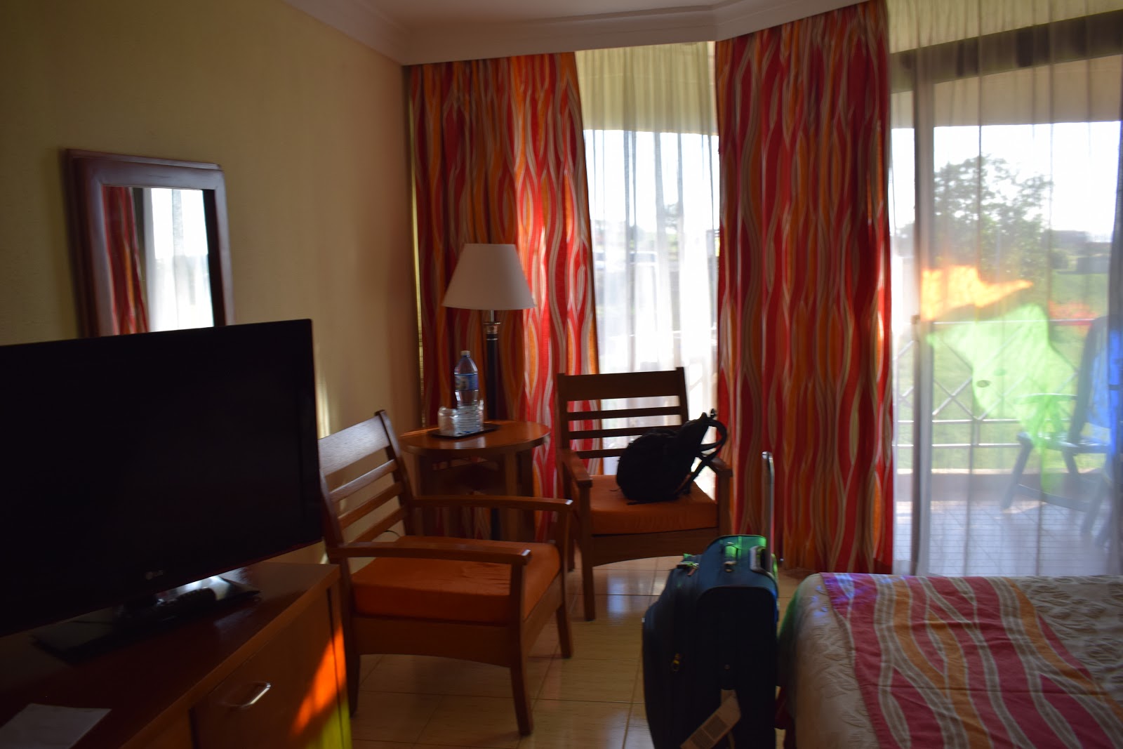 Após o almoço, seguimos até a recepção para fazer o check-in. A recepcionista nos colocou a pulseira, deu 2 cartões da porta. Pegamos as malas no depósito e seguimos para o nosso quarto. O quarto era bem amplo e localizado no prédio principal do resort, tinha tv lcd, varanda, ar-condicionado. O banheiro era antigo, com banheira, mas tinha os produtos de higiene – que são escassos em Cuba. A varanda tinha vista para um castelo medieval em homenagem a Dom Quixote e o restaurante “Meson del Quijote”. A preguiça foi tanta que não visitei a construção.