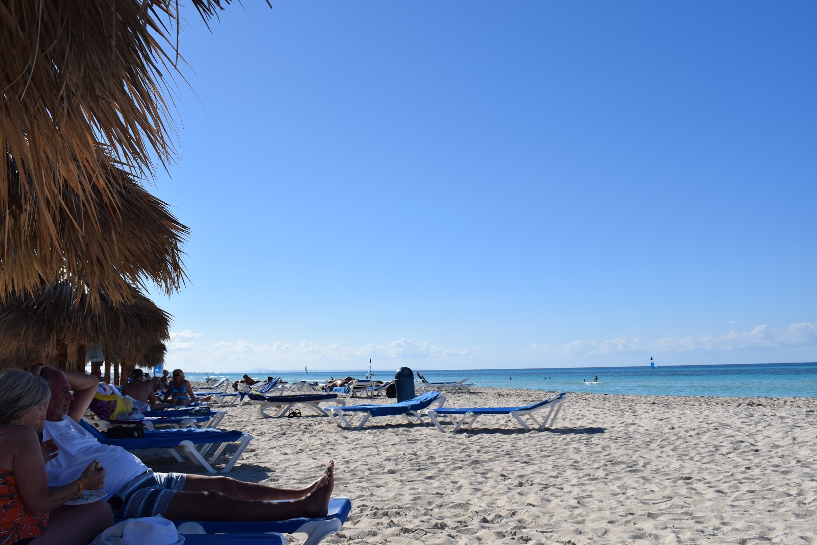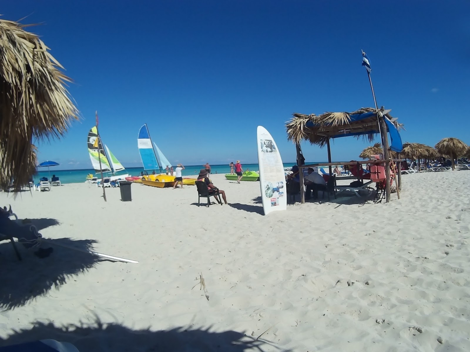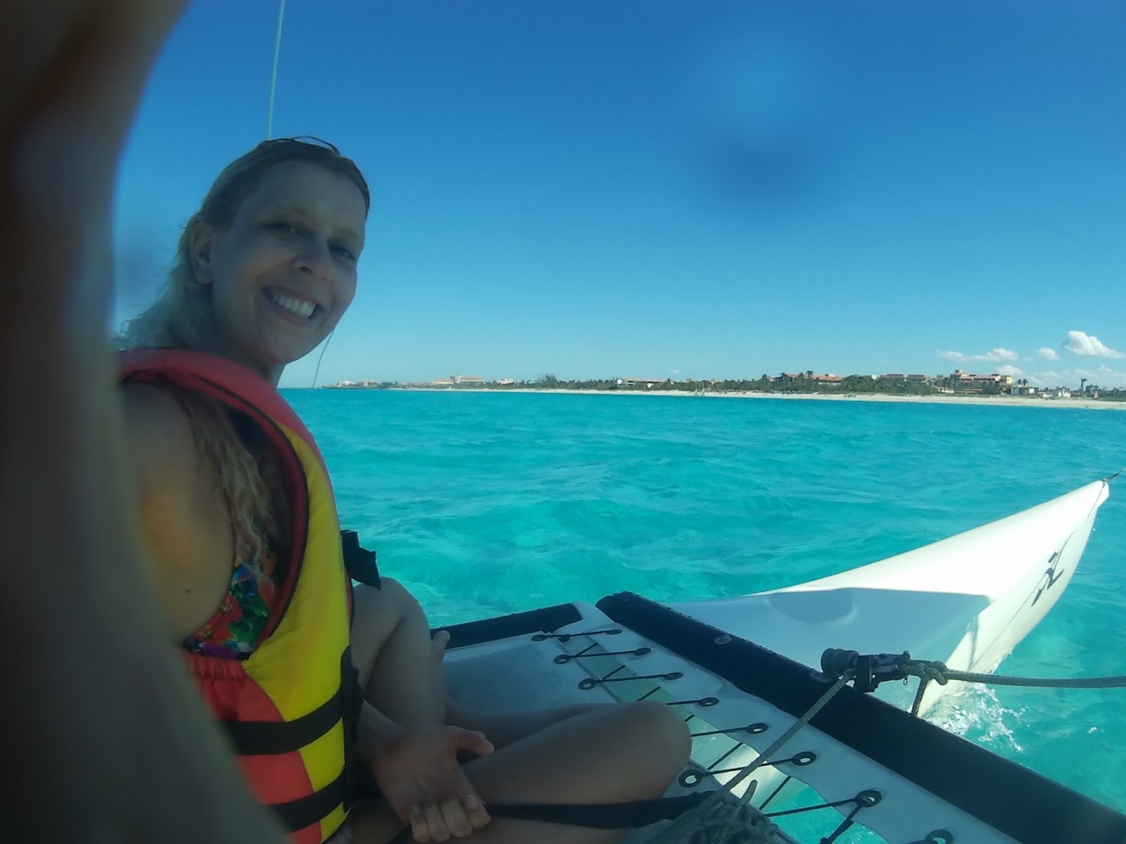 Antes do horário estipulado, o responsável pelos passeios aquáticos me chamou. Coloquei o colete salva-vidas, subimos no veleiro e navegamos por 30 minutos. Ventava bastante e tínhamos que nos segurar com força, pois não tinha assento, apenas uma tela esticada. No fim, perguntou se gostaríamos de ver os peixes de snorkel, por apenas 20 CUC por 1 hora. O preço é ótimo, mas acabamos deixando de fazer a atividade.
