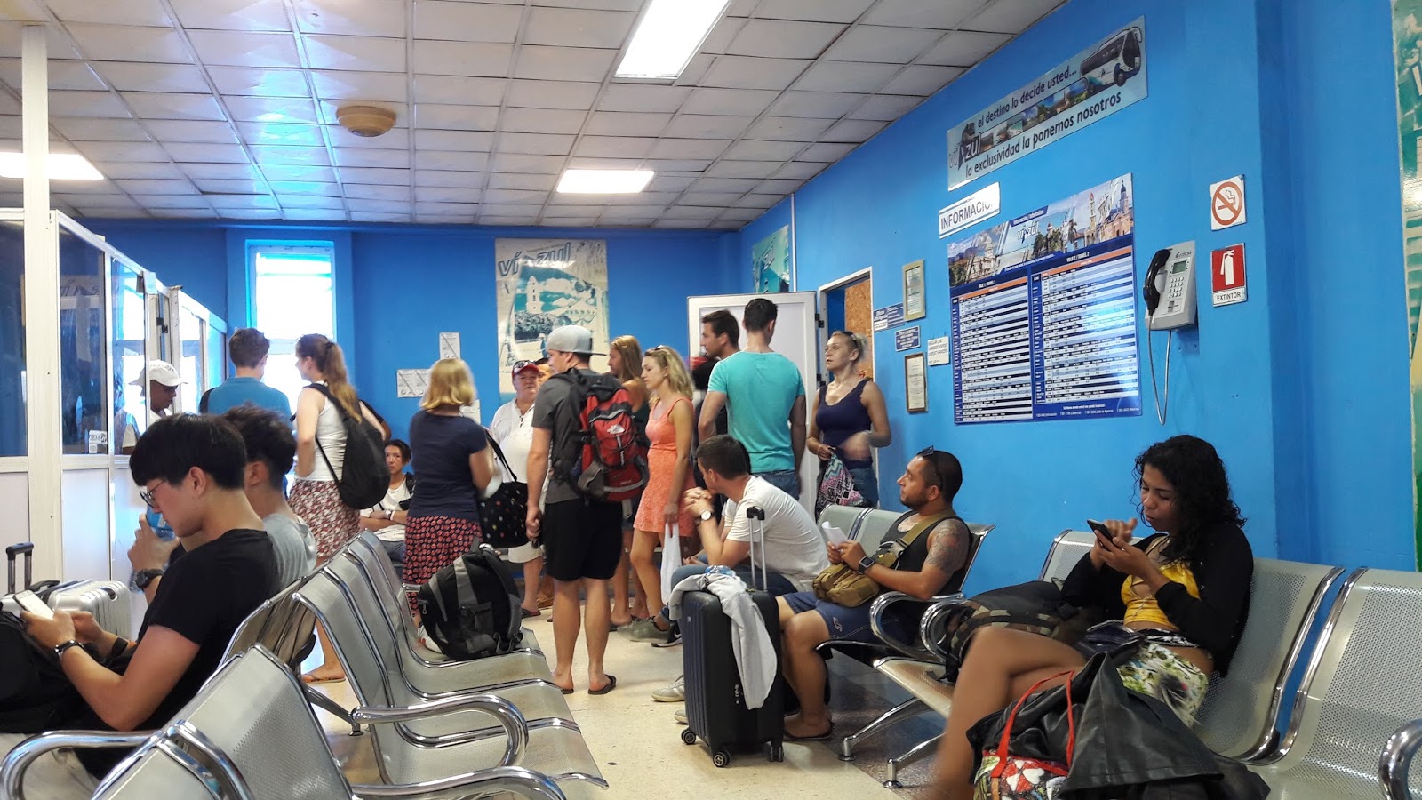 A melhor opção, sem dúvida, foi contratar a ida com o transfer do hotel (são da Transtur). Tomamos café da manhã e saímos do hostel por volta das 8:45. Corremos muito pelas ruas com nossas malas, mas ao chegar no Hotel Plaza, o hall estava cheio de turistas, pois vários ônibus saem no mesmo horário para diversas cidades. O transfer da agência parte apenas às 9h. Fiquei bastante irritada com a falta de informação, e, como relatado, não tínhamos qualquer comprovante de compra. Fiquei uns 20 minutos na frente de uma funcionária da agência Cubanacan, que estava de papo com uma turista, mas a senhora foi grossa, dizendo que deveria esperar a minha vez, no entanto, estava ansiosa, pois o relógio já marcava 9:20h.