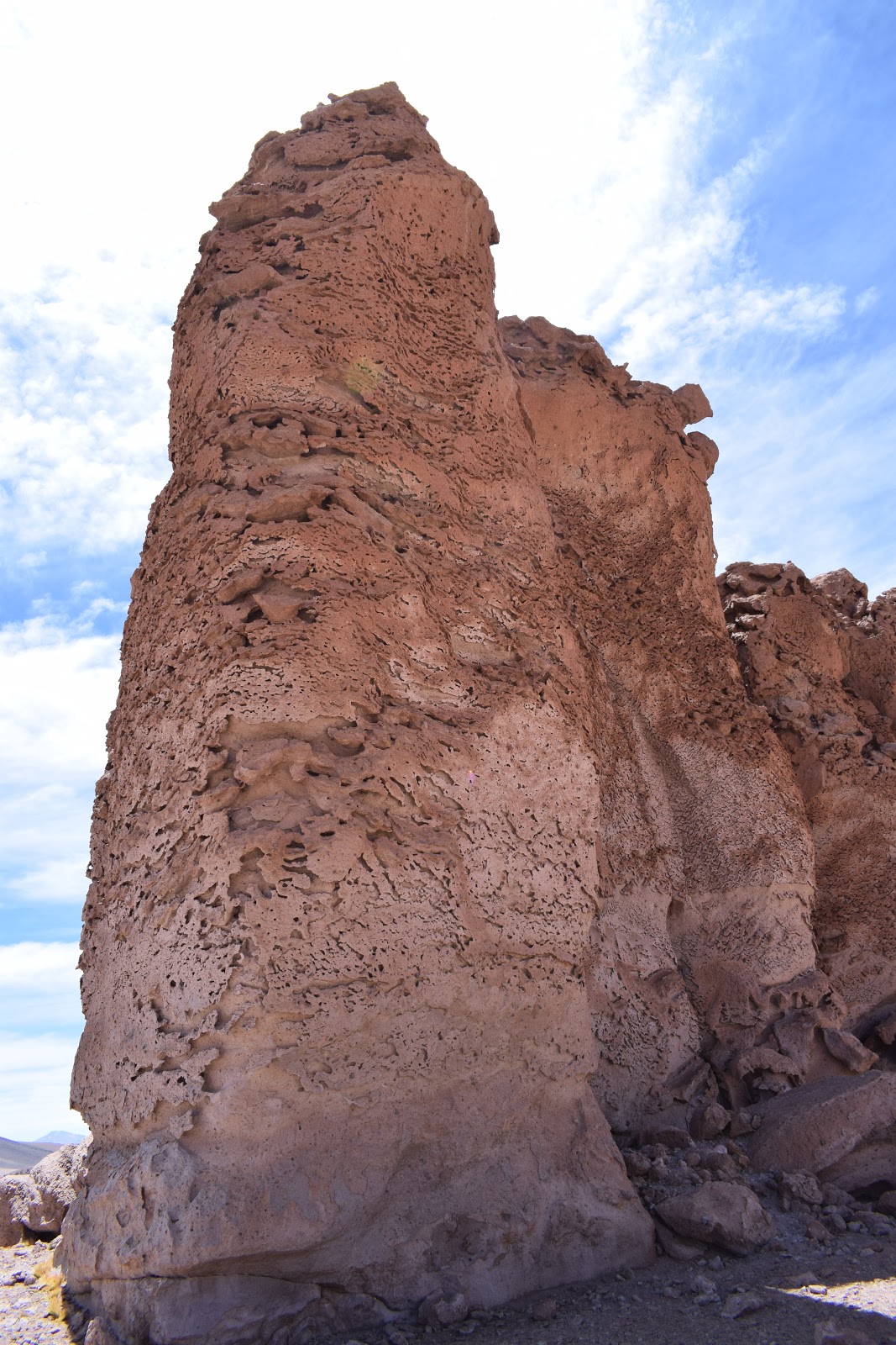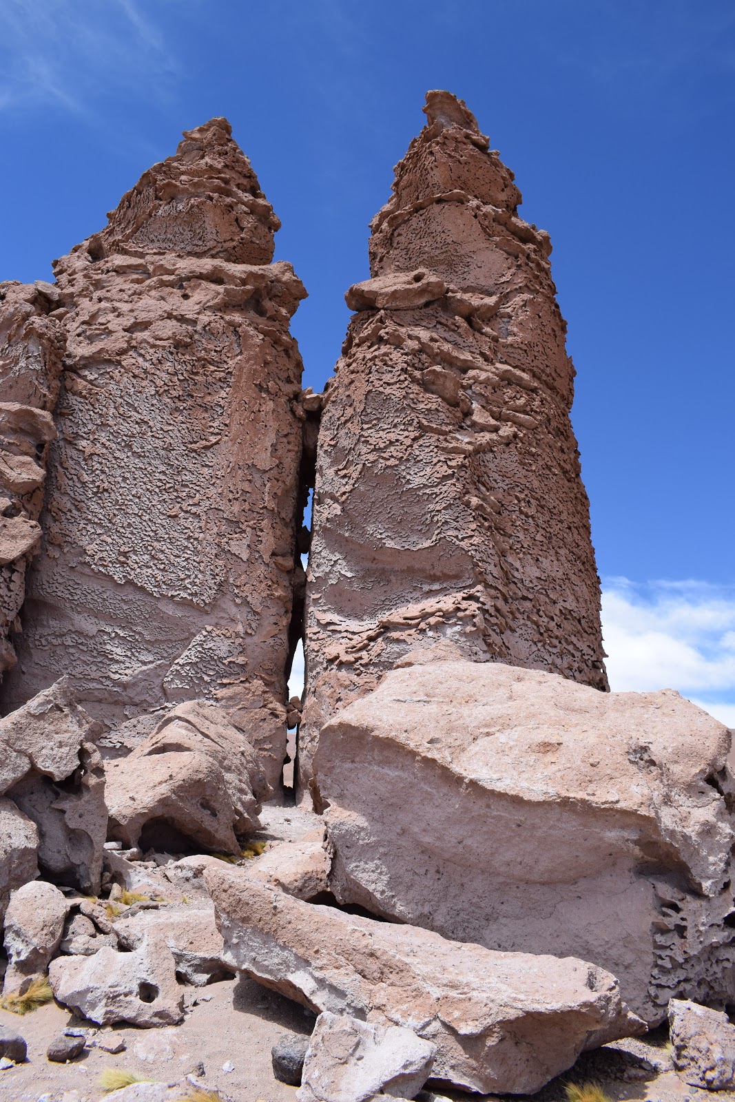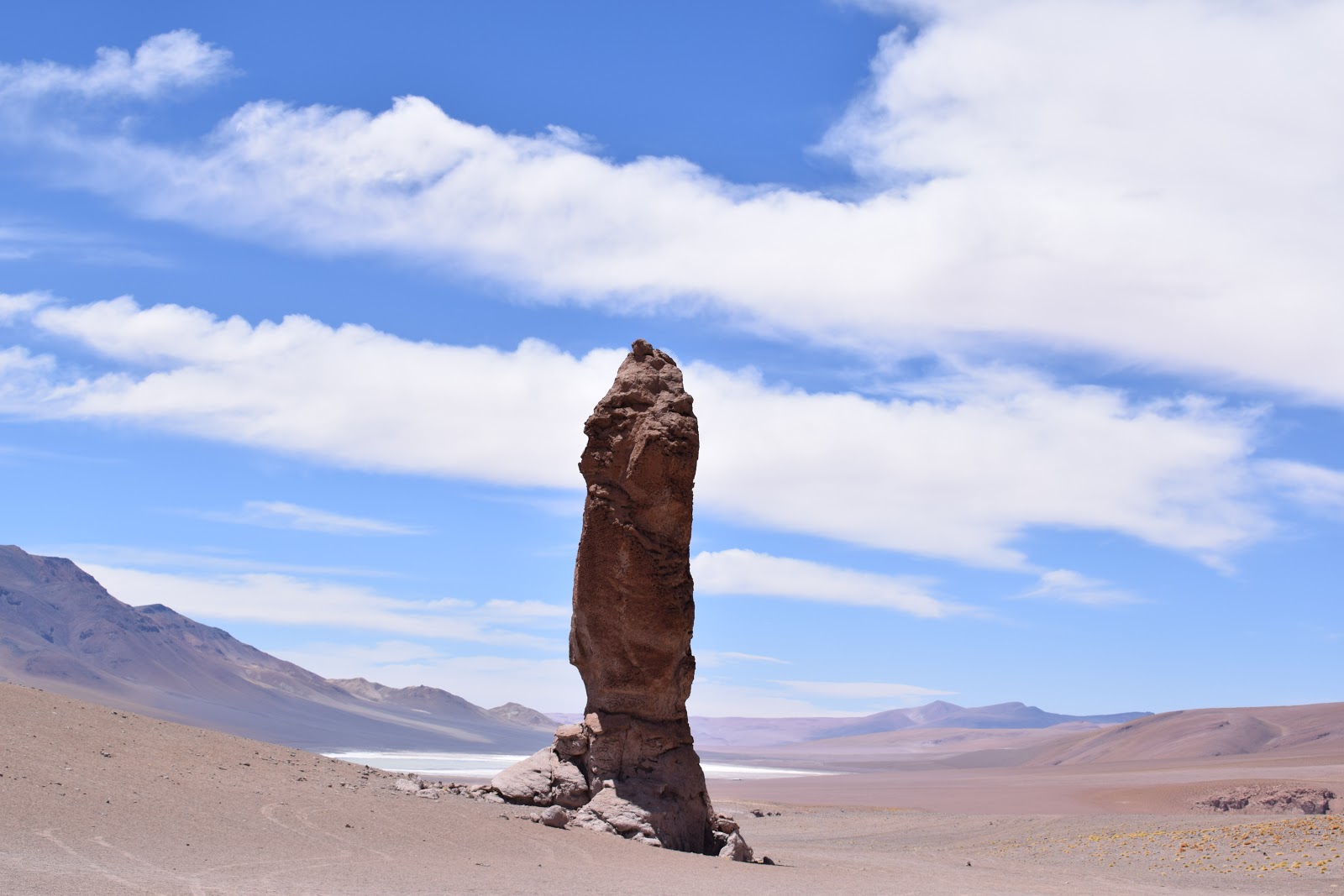 Continuamos o caminho até “Monjes de la Pakana“, que são enormes pilares de pedra verticais e solitários no meio do deserto. Vemos o poderoso trabalho da natureza que esculpiu as pedras com a erosão eólica. O nome é relativo à forma, que muitos identificam como de monges.