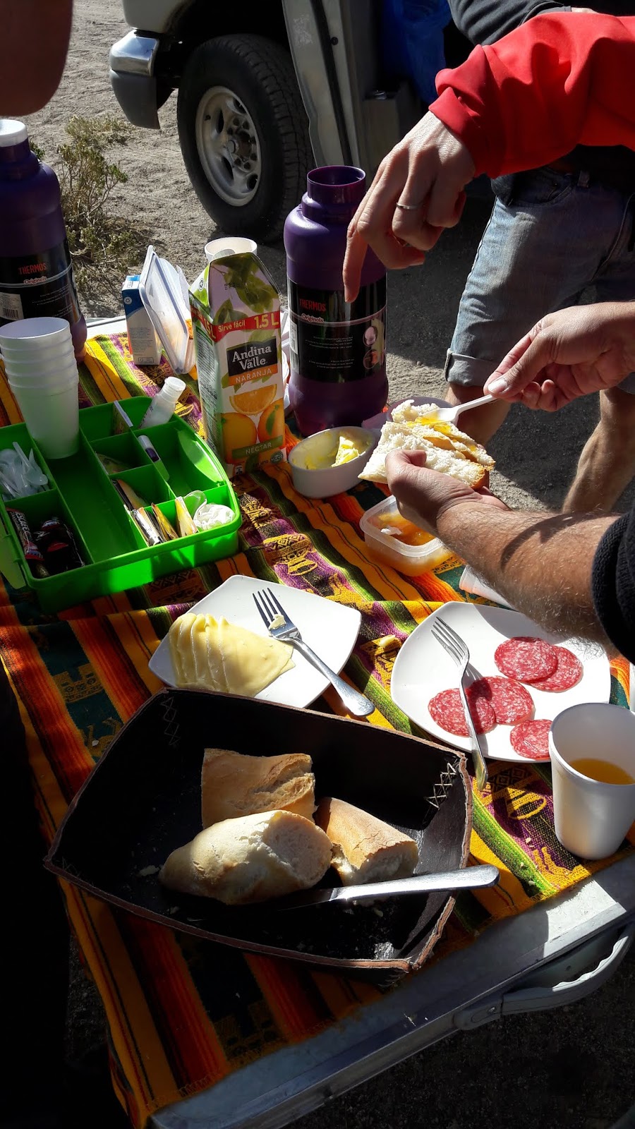 Houve uma parada para o almoço, onde uma empanada assada foi servida para cada integrante do grupo. Tinha com recheio de queijo e de vegetais. Na mesa foi colocada uma enorme garrafa de vinho tinto Concha Y Toro. Algumas pessoas que estavam em outra excursão ficaram olhando o vinho e, como quase ninguém tomou, o guia fez uma doação. Embora o salgado estivesse lindo e cheiroso, não consegui comer. Não conseguia ingerir qualquer alimento. No fim do passeio passamos pelas lagoas branca e verde.