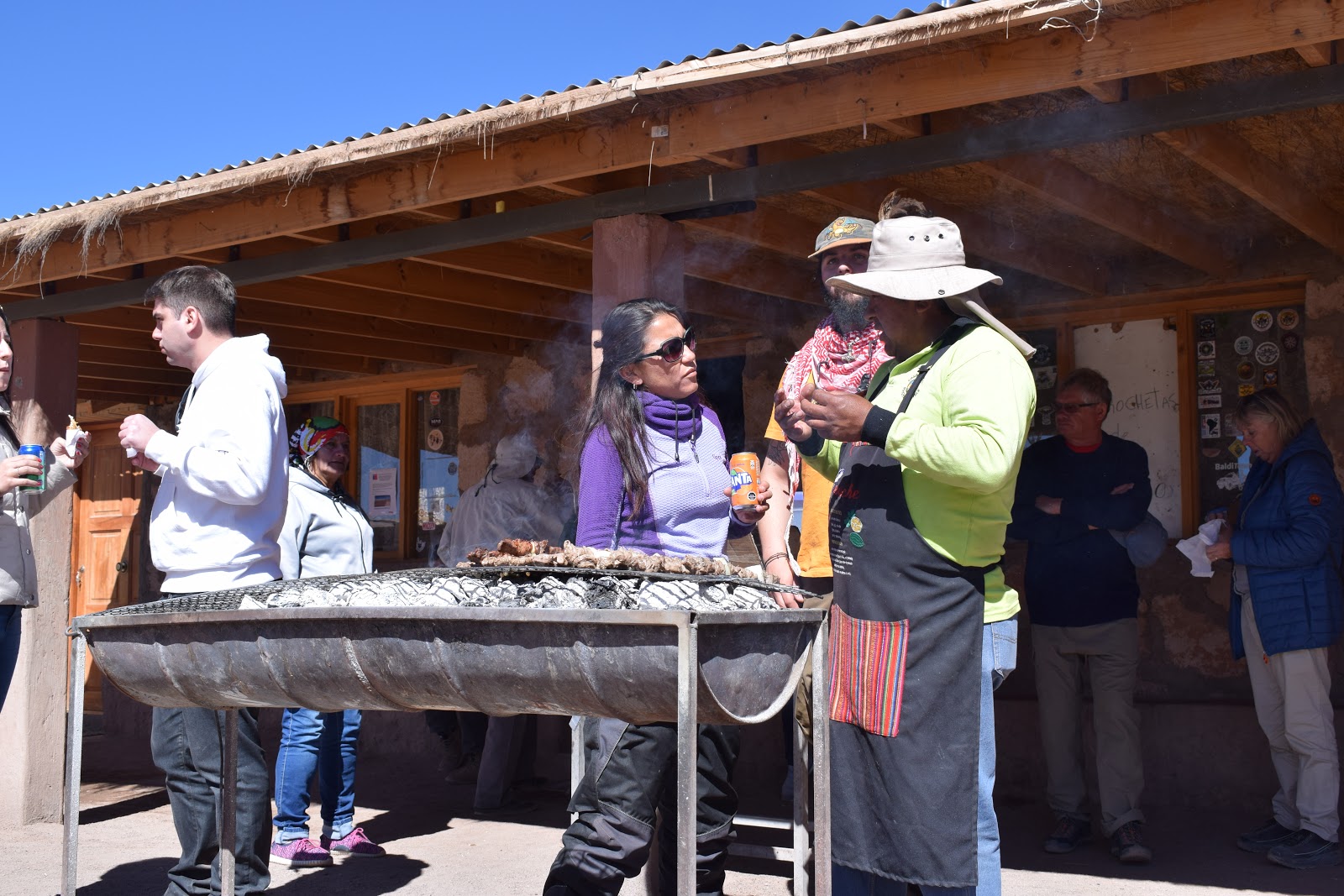 Não comprei roupa especial para usar no Atacama, então, tive que improvisar, pois encontraria a temperatura mais baixa do deserto. Coloquei uma camisa de algodão, uma segunda pele, um casaco fleece, uma jaqueta de couro e depois um casaco de pena de ganso. Coloquei uma calça de legging por baixo da calça jeans, duas meias, luva e gorro. Usei um tênis comum. A dentista que estava no tour usava apenas duas blusas, pois adquiriu roupas térmicas.