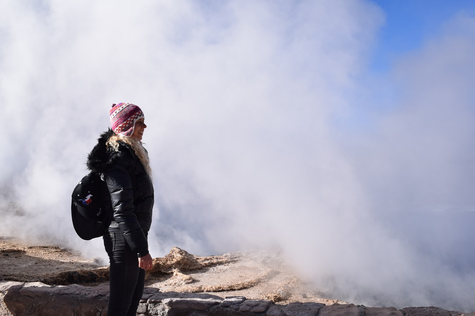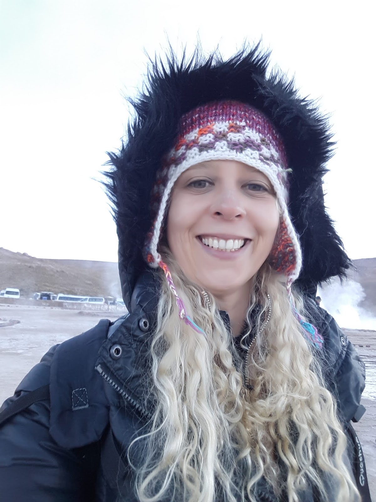 Os Gêiseres de Tatio são um campo geotérmico localizado a 89 km de distância de San Pedro, na Cordilheira dos Andes. A altitude é de 4.200 metros acima do mar. A viagem é longa e tortuosa numa paisagem completamente desértica. É necessário chegar no sítio antes dos primeiros raios de sol. Apesar do visual de cebola, senti frio quando me deparei com a temperatura de -9!!! Nos momentos em que tirava a luva para fotografar, os dedos ficavam congelados. Meus dedos dos pés gelaram também.