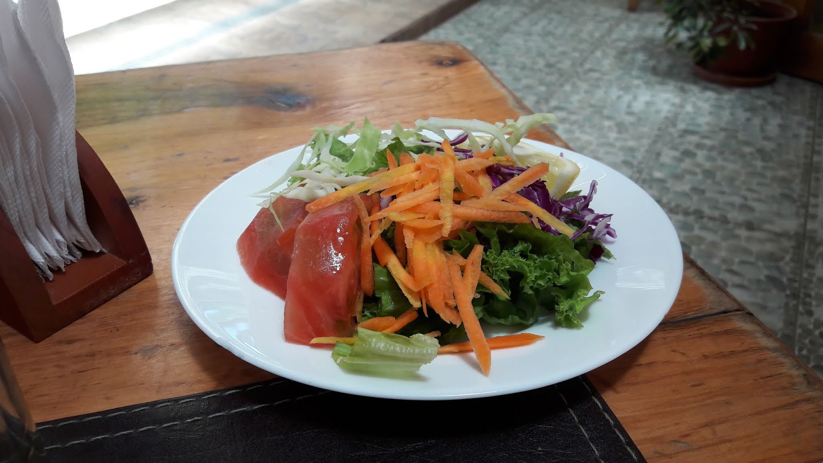 Novamente tentei fazer uma refeição, dessa vez no hostel que estava, o “Residencial e Restaurante Chiloé“, que, na verdade, é um restaurante com quartos para alugar. Tem menus que variam diariamente por um bom preço, se compararmos com os demais daquela localidade (6.500 pesos), embora não seja tão saboroso. Tem entrada, prato principal, sobremesa e bebida. Pedi salada, uma sopa de lentilha e um flan. Estava no fundo do poço, pois quase não consegui comer. Sentia enjoo em cada colherada. Era o quarto dia seguido com a saúde debilitada.