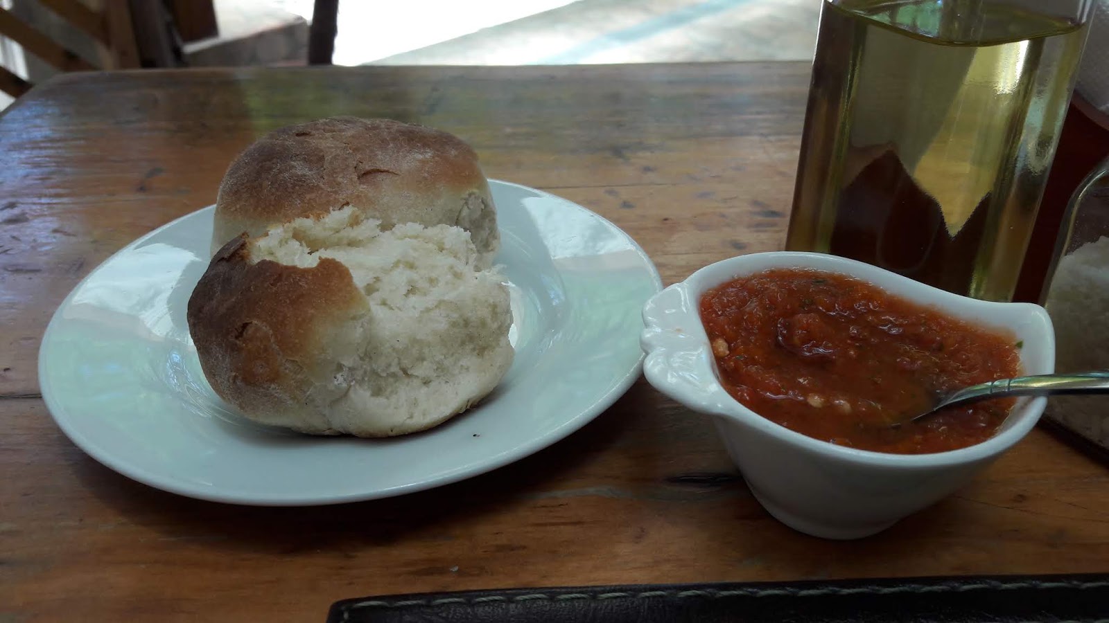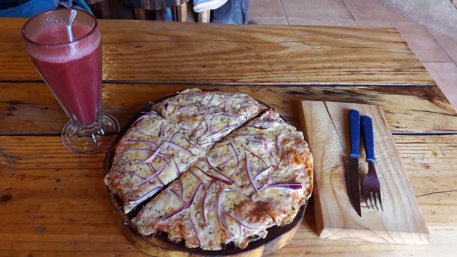 No retorno, segui para o hostel, tomei banho e conclui que teria que comer alguma coisa, pois estava há 2 dias sem fazer qualquer refeição. Então fui na pizzaria “El Charrúa”. Dois dias antes tentei comer lá, mas senti enjoo na porta e estava com fila de espera. Dessa vez, como cheguei cedo, me sentei imediatamente. Pedi uma pizza simples (é quase uma “brotinho”), pedi que adicionassem cebola. Quis tomar um suco de morango. Achei o preço, após conversão, bem caro. Custou R$50,00.