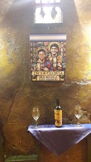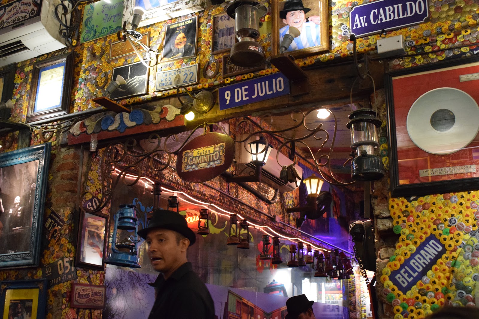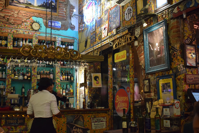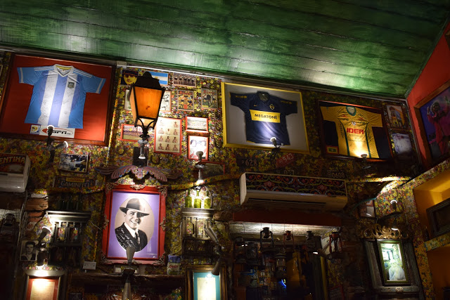 Retornamos para a cidade amuralhada e decidimos comer no restaurante “Marzola Parrilla Argentina“, pois minha irmã ainda queria comer churrasco. Pedi apenas um “choripán“, que é um sanduíche de linguiça com molho chimichurri. Achei caro, mas o Madero cobra R$35,00. A graça do local é a decoração, que já começa no exterior. É totalmente kitsch, pois encontramos camisas de time, quadros, objetos.
