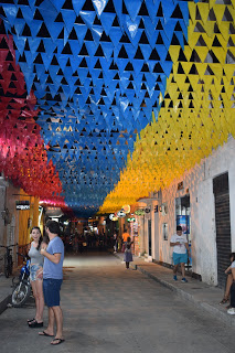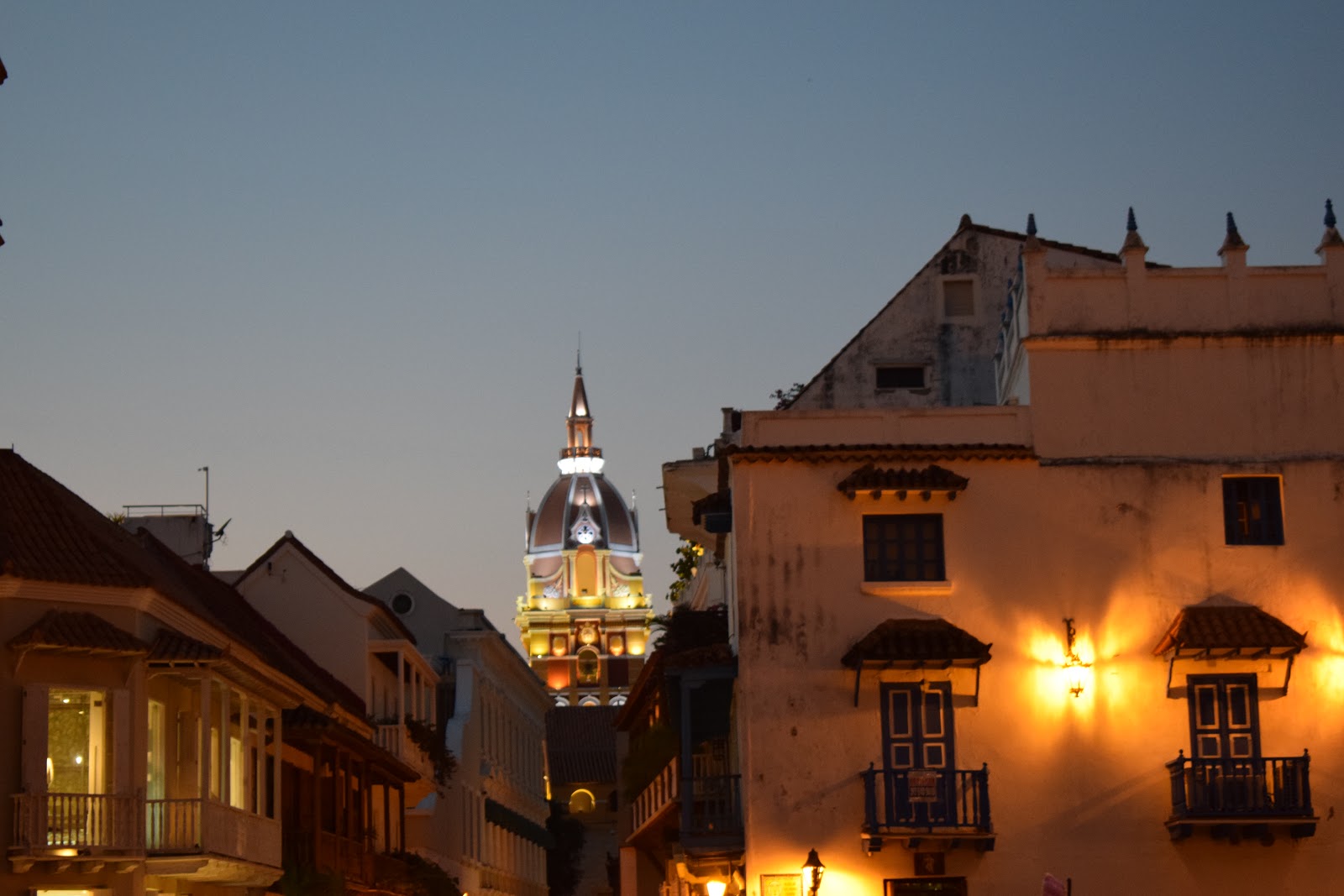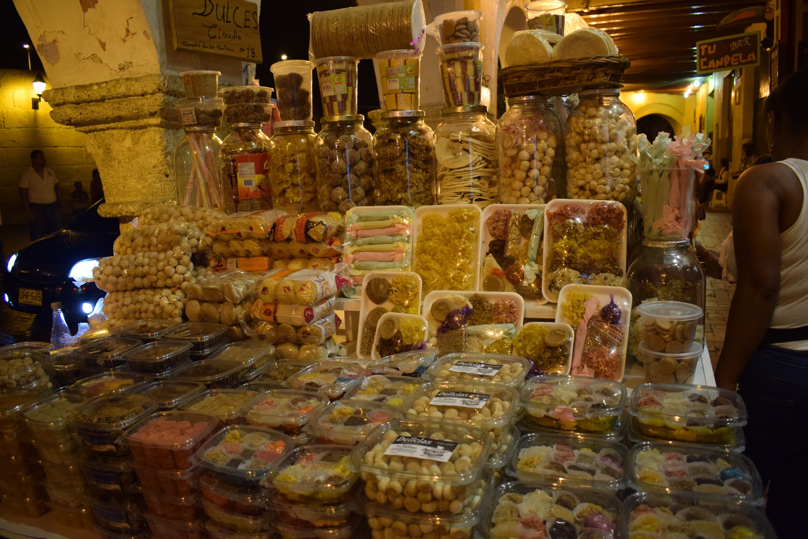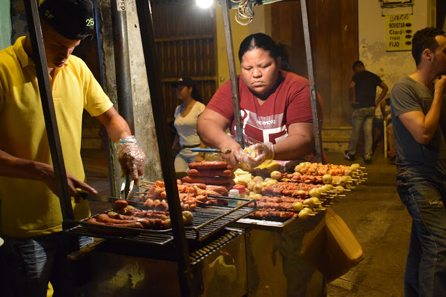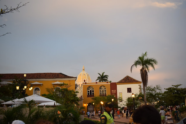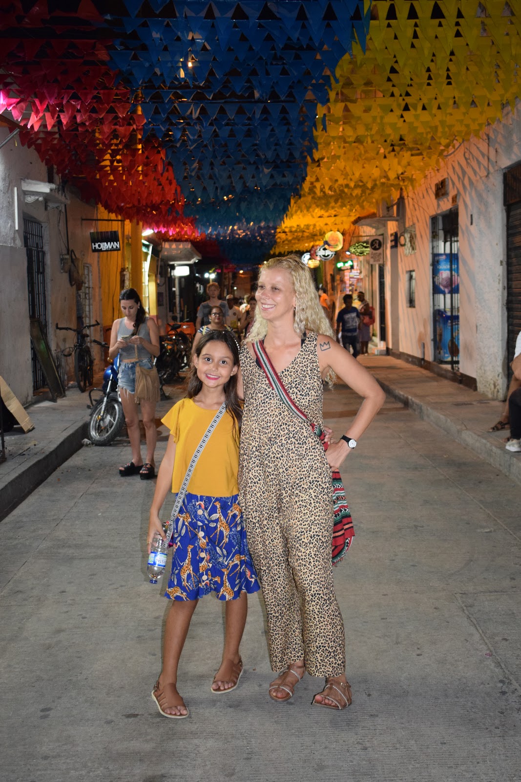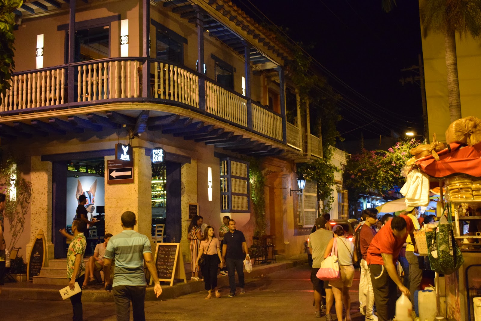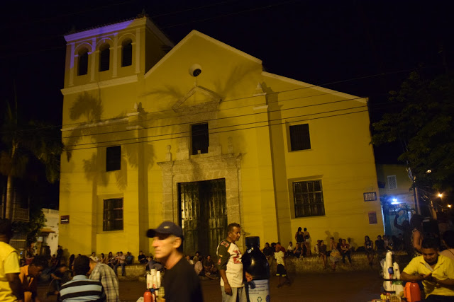 O caminho, depois que saímos dos muros, era bem escuro, pois a cidade não é bem iluminada, mas o assédio dos vendedores só ocorre dentro dos muros. Perguntamos no hotel sobre segurança e a dona disse que era tranquilo seguir até lá. Encontramos uma rua iluminada e decorada com bandeirinhas com cores da bandeira da Colômbia, então fomos explorá-la. Tinha um mercado (minha irmã comprou cerveja), vi hostel, pizzaria, lojas.
