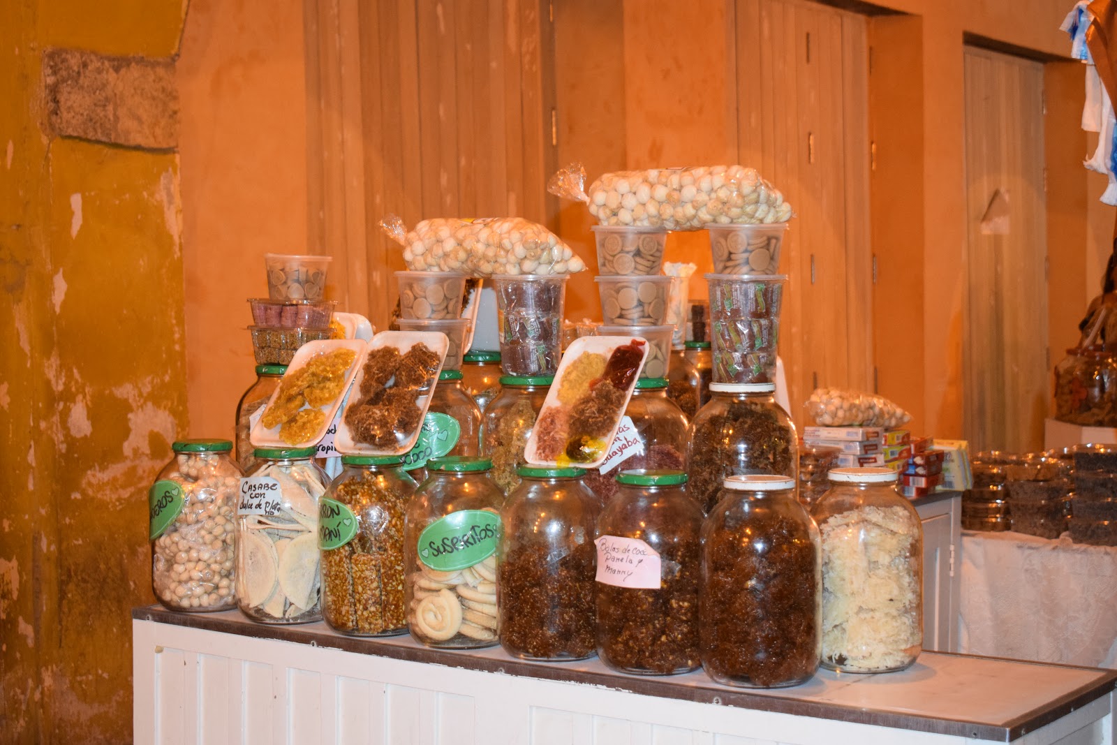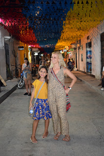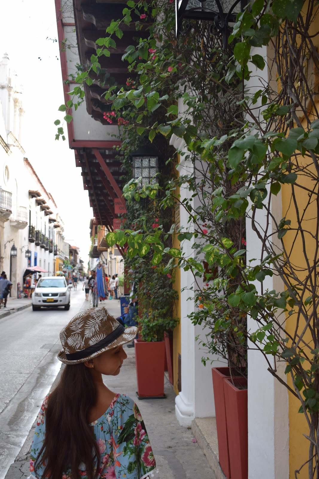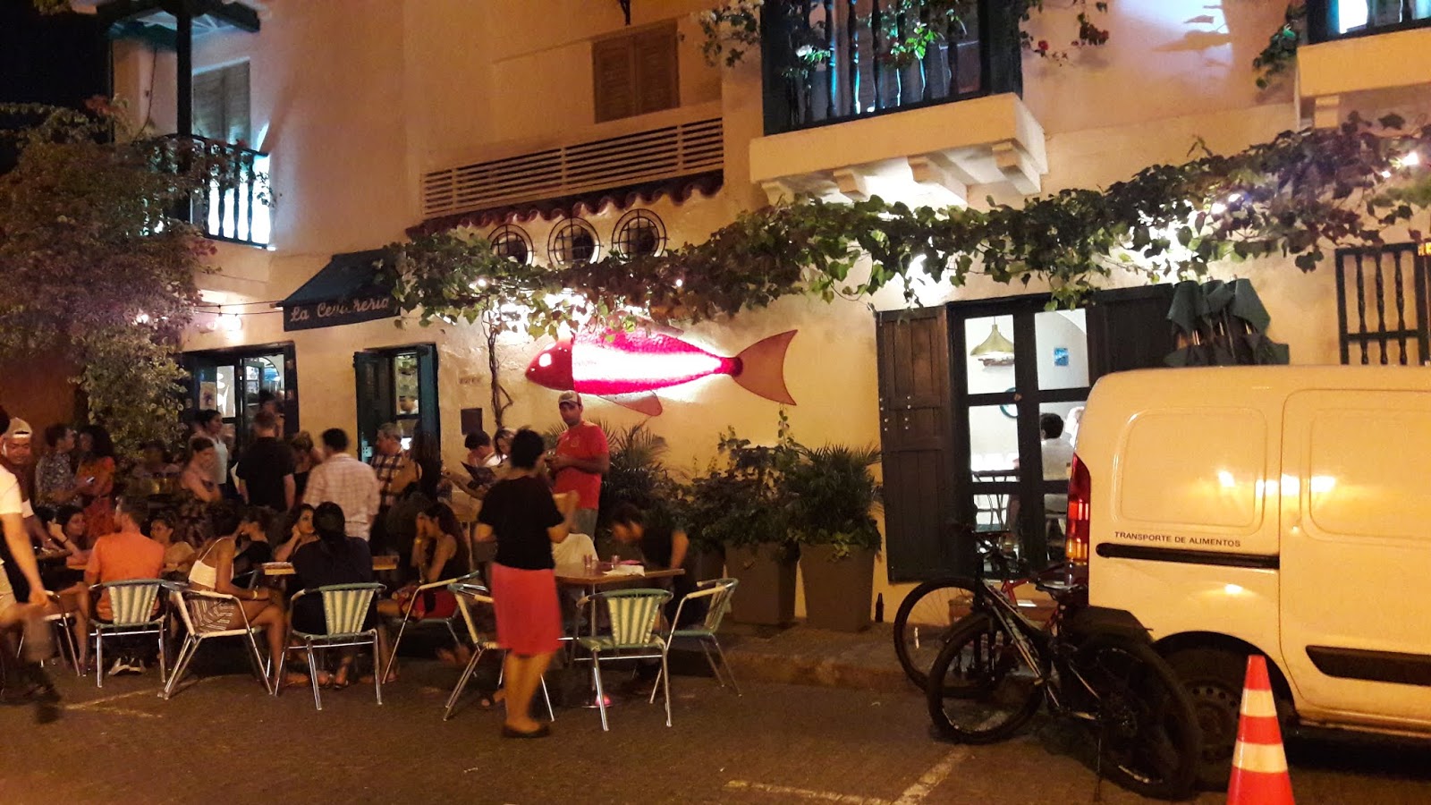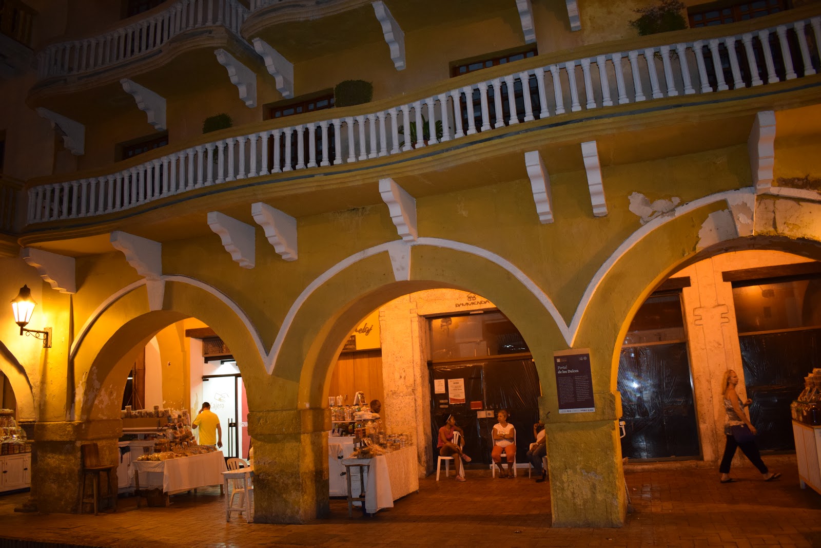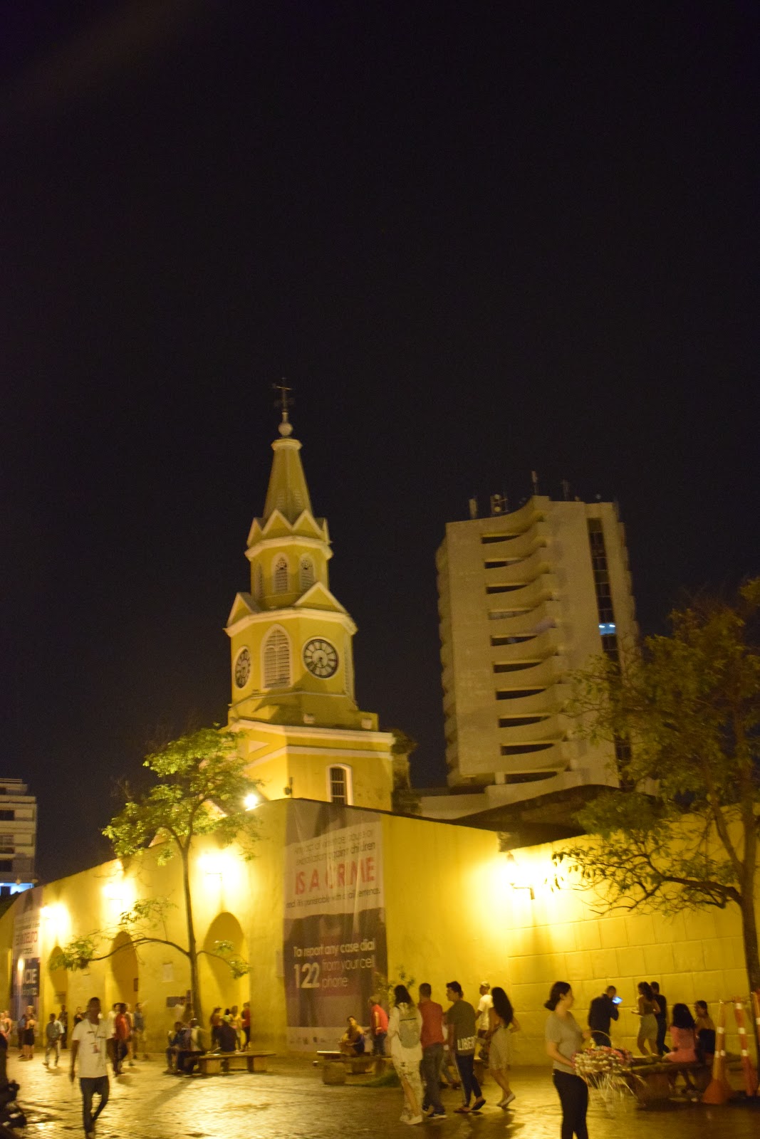 O caminho, depois que saímos dos muros, era bem escuro, pois a cidade não é bem iluminada, mas o assédio dos vendedores só ocorre dentro dos muros. Perguntamos no hotel sobre segurança e a dona disse que era tranquilo seguir até lá. Encontramos uma rua iluminada e decorada com bandeirinhas com cores da bandeira da Colômbia, então fomos explorá-la. Tinha um mercado (minha irmã comprou cerveja), vi hostel, pizzaria, lojas.