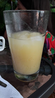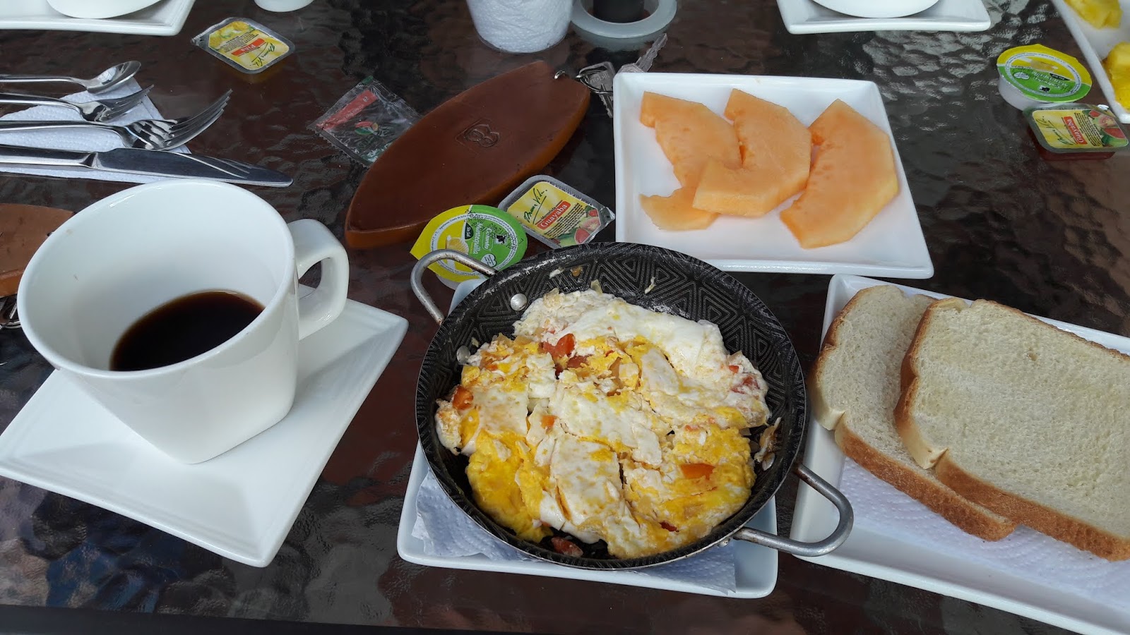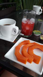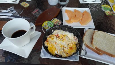 No dia seguinte, acordamos e fomos tomar o café da manhã do hotel, que era bem simples: um ovo mexido, duas fatias de pão, uma fatia de fruta e café. Num dia teve suco de corozo e no outro suco de chicha de arroz con piña, mas não estavam listados como itens do café.