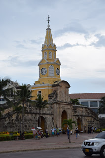 Depois que escureceu, fomos conhecer a Torre del Reloj, que fica na Puerta del Reloj, que é a principal entrada da cidade fortificada, foi construída em 1540, mas inaugurada apenas em 1630. A torre recebeu o relógio no início do Século XVIII. É um considerada uma obra de sucesso da Escola de Fortificação Hispanoamericana