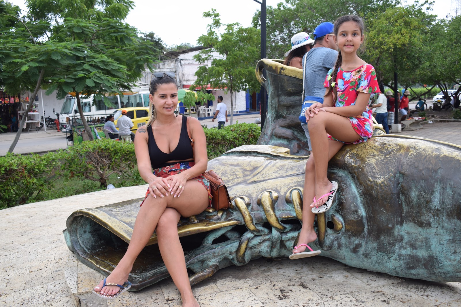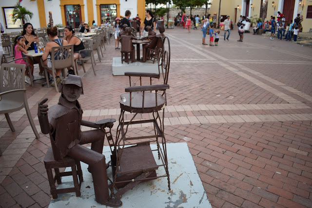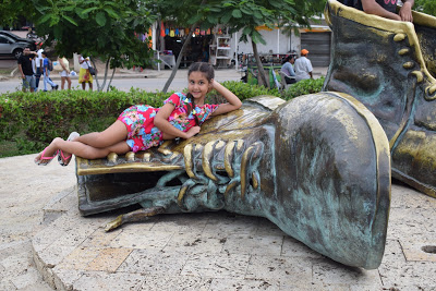 Paramos na escultura de bronze “Los zapatos viejos“, feito para homenagear Don Luis Carlos López, poeta de Cartagena, que ficou conhecido pelo soneto “A mi ciudad nativa”.