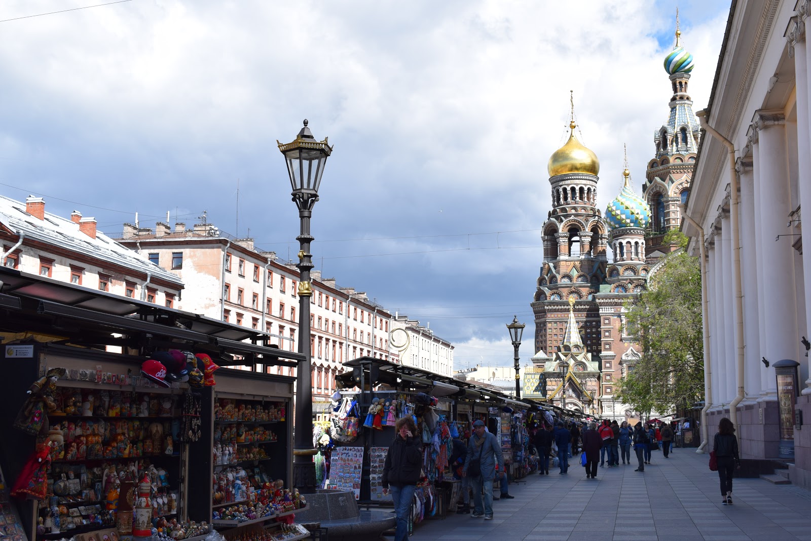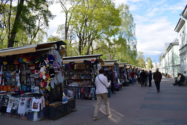 São inúmeras barracas dispostas na calçada ao lado do canal (Griboedov canal embankment). Vendem diversos modelos de matrioska (boneca russa artesanal), camisas, capas de almofada, canecas, etc. Finalmente encontrei um lugar em que todos falavam inglês e até arriscavam palavras em português e espanhol. A maioria dos objetos não possuem preço, mas, mesmo os que estão etiquetados podem ser negociados. Minha tática é perguntar o preço para alguns vendedores e depois começar a negociação. No fim, comprei 8 matrioskas de tamanhos variados. Meu amigo comprou matrioskas, caneca, capa de almofada, copo para vodka, busto de Lenin…