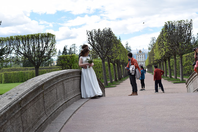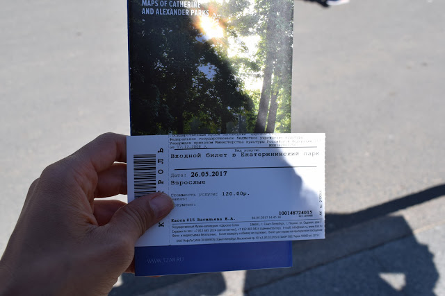 Seguimos o fluxo até encontramos a bilheteria. Não tinha informação em inglês e a senhora também só se comunicava em russo. A melhor opção é comprar online, pois o site tem a versão em inglês. Só sei que adquiri um ingresso por 120 rublos e só vi o Catherine Park, sem entrar no Palácio, mas também não tinha mais tempo. Particularmente, achei os jardins do Palácio de Catarina muito mais bonitos que os de Peterhof.