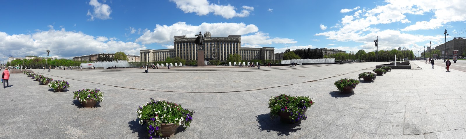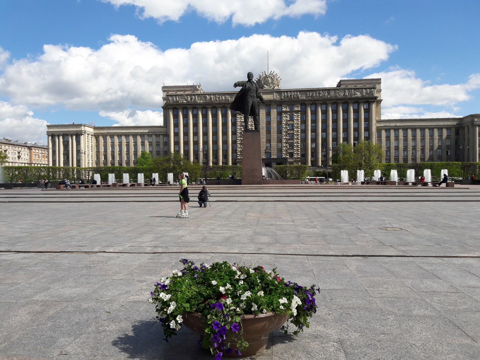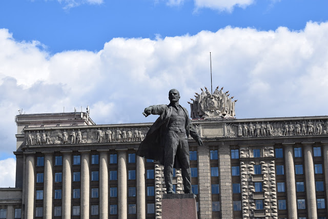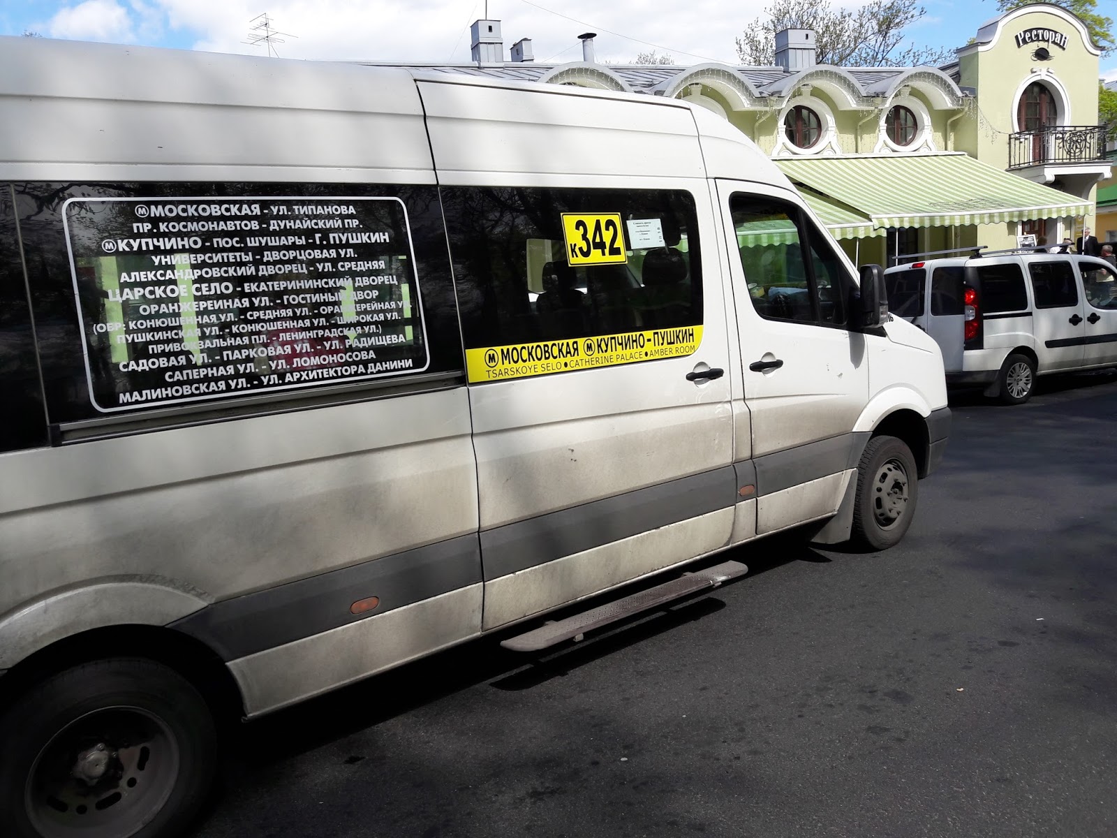 Encontrei placas com o alfabeto cirílico e alfabeto romano, portanto, não tive a menor dificuldade de me localizar. Mesmo assim, contei as estações e desceria 6 estações depois. A estação Moskovskaya é a mesma que tem os ônibus/vans para o aeroporto. A estação que desci parecia um bunker – um paredão de concreto com um portão de ferro, que só abre quando o metrô chega. Saindo da estação, encontramos um enorme monumento em homenagem a Lenin. A cidade parece bem segura, pois no local havia muitas crianças brincando. Na rua logo atrás da escultura, encontramos diversas vans estacionadas. É o ponto final. Identifiquei que a linha 342 (van) tinha como destino o “Catherine Palace”. Li que a linha 545 também deixa no local.
