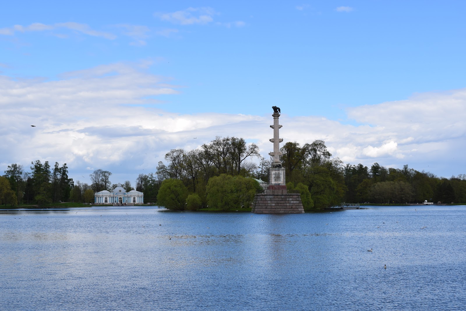 A fachada do Palácio de Catarina é primorosa – composta por esculturas, paredes azuis e detalhes dourados. Os monumentos encontrados no complexo são: Catherine Palace, Cold Bath, Cameron Gallery, Upper bathouse, Lower bathhouse, Hermitage, Hermitage Kitchen, To my dear comrades in arms gate, Grotto, Admiralty, Hall on the island, Chesme column, Marble Bridge, Turkish bath, Pyramid, Gothic Gate, Tower Ruin, Orlov gate, Girl with a pitcher fountain, Concert Hall, Kitchen ruin, Creaking Summer house, Evening hall, Private Garden, Duty Stable, Alexander Palace, White tower, Martial Chamber, Imperial farm, Chapelle, Arsenal.