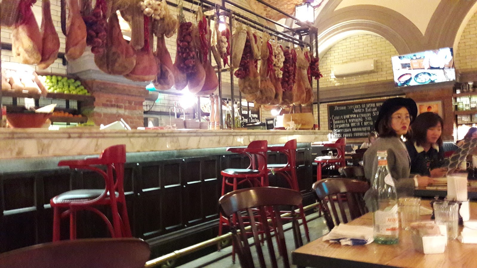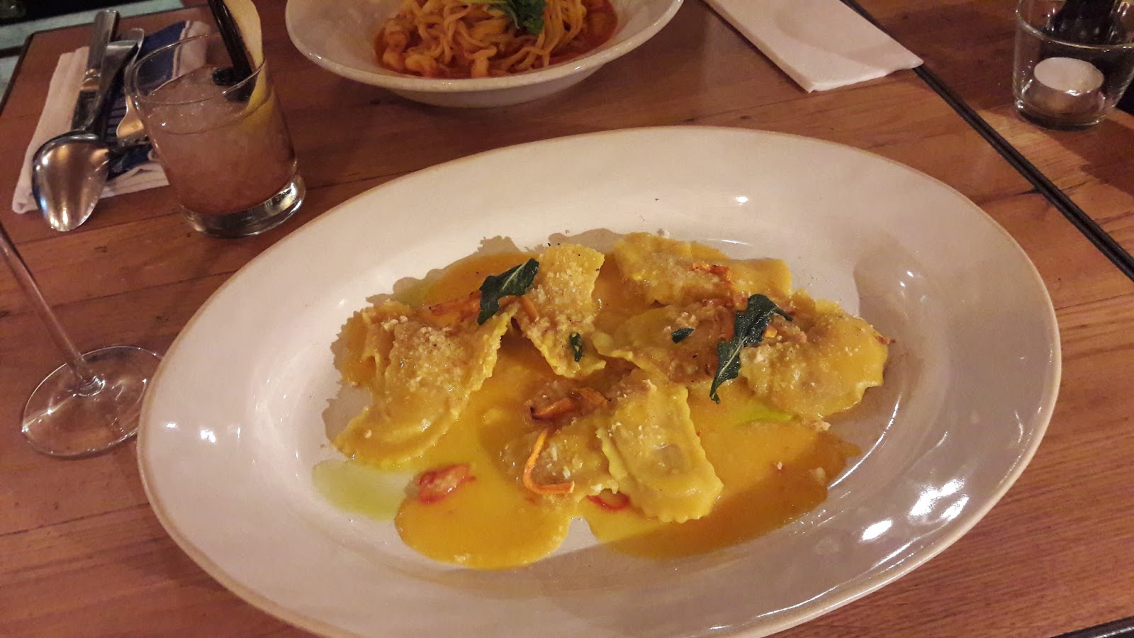 Estava com fome e com rublos sobrando, então pedi um drink (mais caro que o prato principal): Rossini. De entrada pedi crispy squid (lula) e croquetes de espinafre com ricota com um molho maravilhoso de tomate. O prato principal foi um ravioli de abóbora (homemade half moons of pasta filled with roasted squash & ricotta in a pumpkin sauce with rosemary & crushed amaretti). Para finalizar, comi a melhor sobremesa da minha vida: Panna cotta de baunilha com framboesa. E pedi outro drink “Dubble bubble” (vinho, cereja, licor de maça e capim-limão). Foi a melhor refeição da minha vida! Os preços estão no site, então não tem surpresa. Eu e meu amigo gastamos 3.650 rublos, cerca de 195 reais. A minha parte deve ter totalizado R$100,00. Duvido que o preço do restaurante do Jamie Oliver em São Paulo seja tão atraente quanto em São Petersburgo.