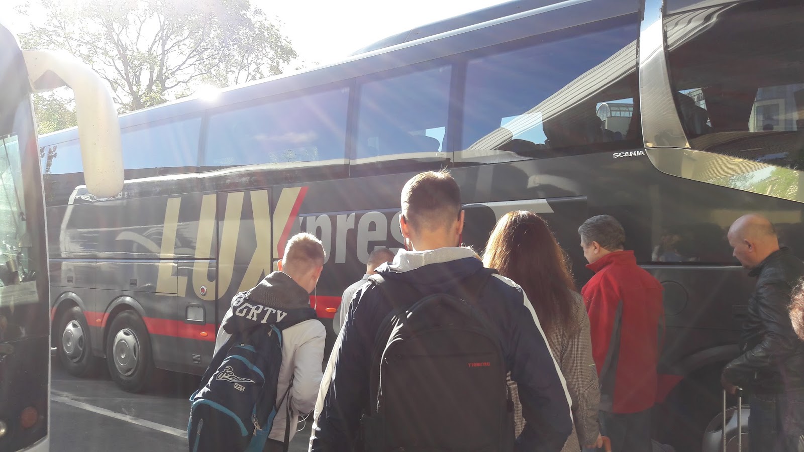 Ao chegar na rodoviária Coach Station, tivemos que passar as malas pelo raio-x. O local tinha muitos agentes do exército fiscalizando. Os turistas eram majoritariamente russos. Esperamos mais de uma hora. Não tinha local para lanchar e tive que usar o banheiro imundo. Os ônibus param no terreno atrás da rodoviária, conforme plataforma indicada no letreiro. Assim que a nossa plataforma foi indicada, pegamos as malas e seguimos para a área externa. Ficamos apavorados com os ônibus russos que paravam, mas, por sorte, o ônibus da Lux Express é maravilhoso, com wi-fi, tv, café, cappuccino, chá, água e banheiro. Muito mais confortável que viajar de avião. Assim que parou, entregamos a mala e recebemos um comprovante, depois mostramos o passaporte para o motorista, que tem uma tabela com o nome dos viajantes.